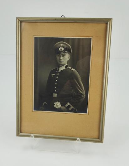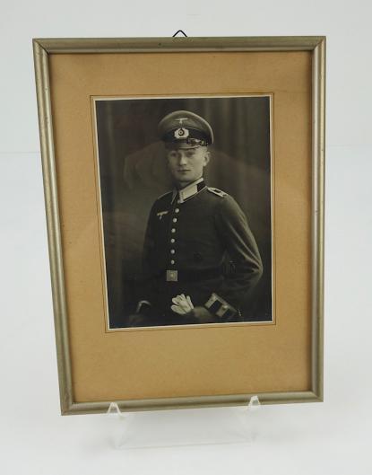 Very nice framed photo of a jong Wehrmacht NCO of the 88th Infantry Regiment. Wearing a wound badge in black and a dress bajonet. In very good condition.