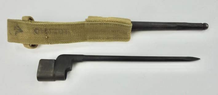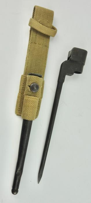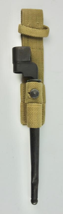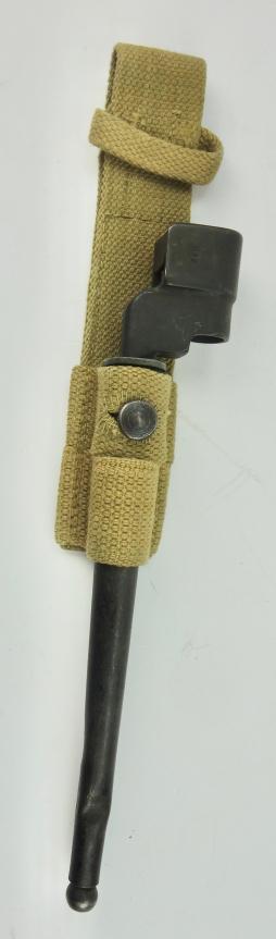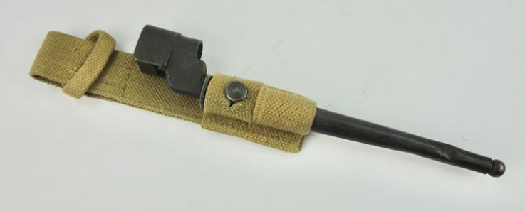 British WW2 Spike Bajonet with Webbing Frog Nice used British WW2 spike bajonet with nice webbing marked bajonet frog. In very good condition.