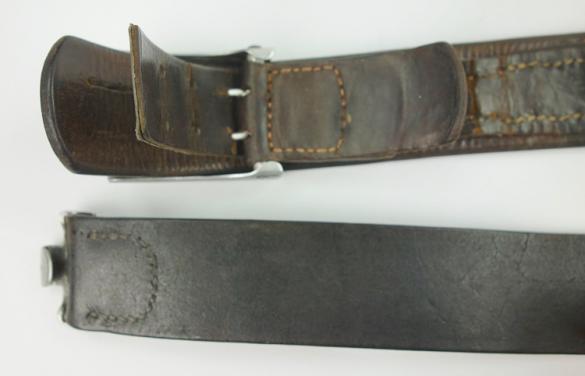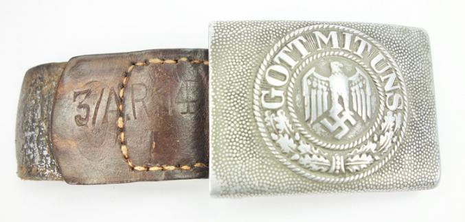 Very nice early leather Wehrmacht combat belt witg early aluminum made belt buckle with its original leather tab, which is nicely marked “3/A.R.14”