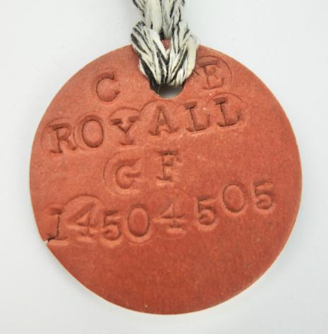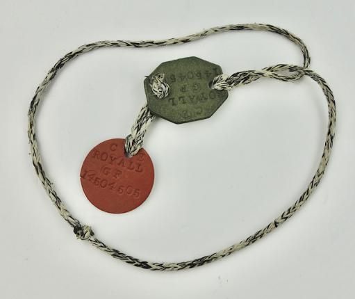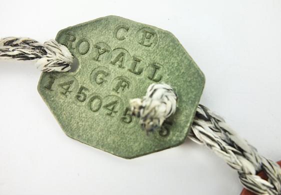 British WW2 Dog-Tags Marked “C.E.Royall C.F.” And army number. Nice British dog-tag set in used but very good condition.