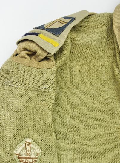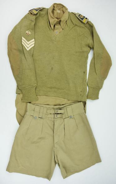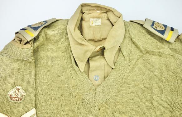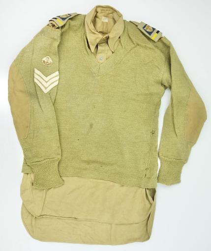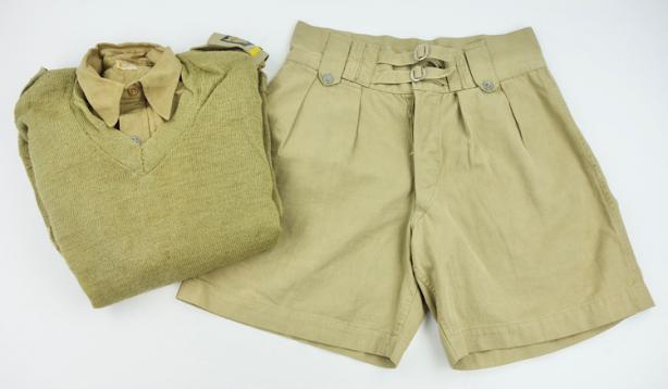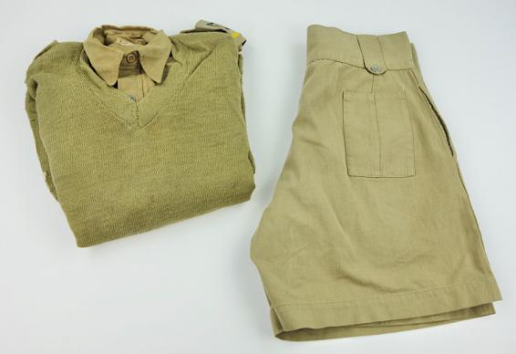 Nice used Tropical shirt with shoulder insignia, shorts, sweater, dog-tag, ribbon bar and to leather bracelets.
