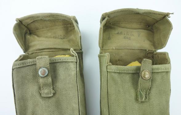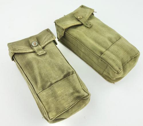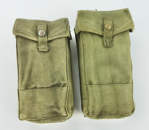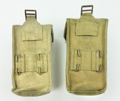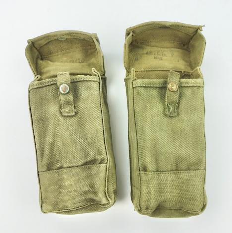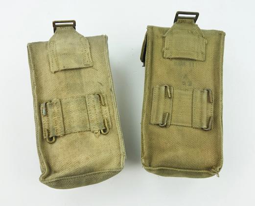 British WW2 Basic Pouches Nice used British WW2 basic pouches with wartime “blankcoat” both pouches are maker market and dated “1942” overal nice British basic pouches in used but very good condition.