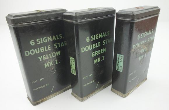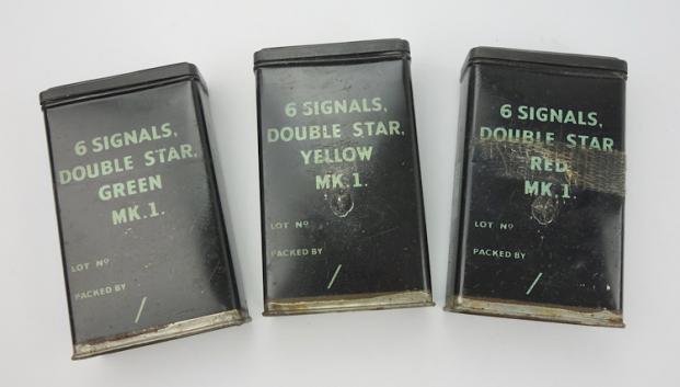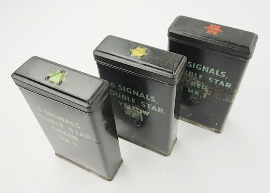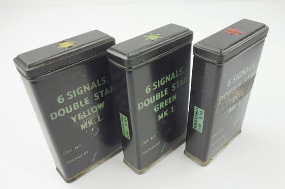 3 British WW2 Flare Containers One container for red flares, one for yellow flares, one for green flares 6 flares in every container, dated May 1945 In very good condition