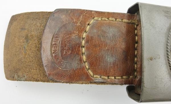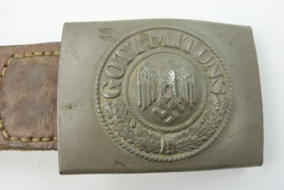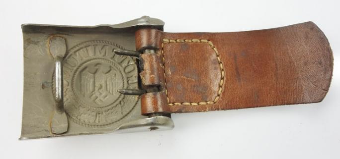 Wehrmacht steel Belt Buckle with leather Tab Nice used Wehrmacht steel belt buckle with leather tab. In 95% of its original camo paint. Dated “ in used but very good condition.