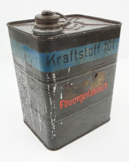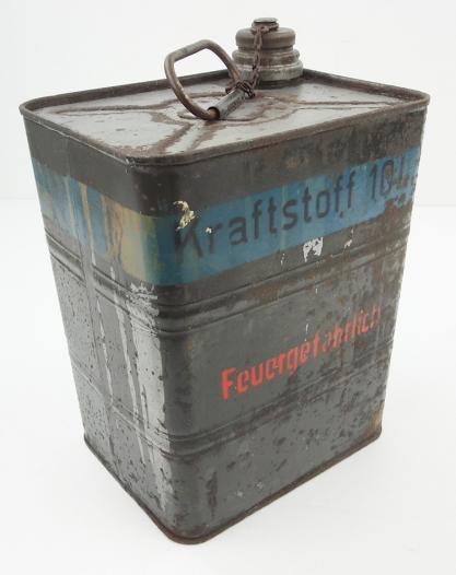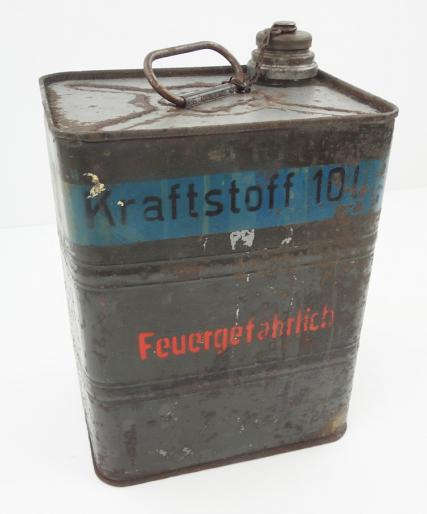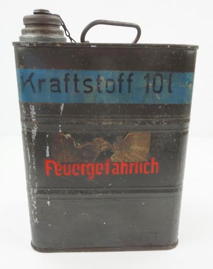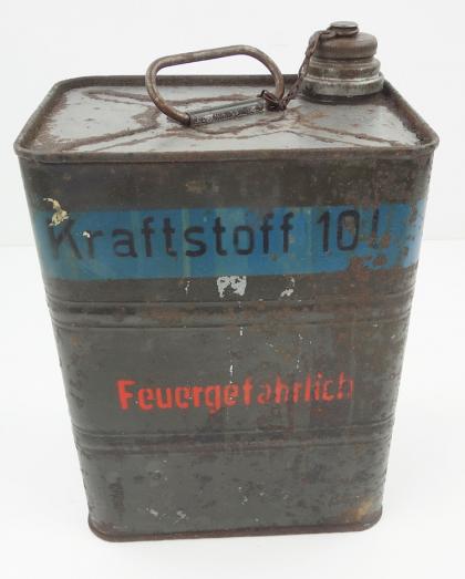 Wehrmacht Kraftstoff (Fuel) Canister (Jerrycan) Very nice used 10 liter fuel jerrycan “Kraftstoff 10 L, Fuergefährlich” Nice for display or for a vehicle! In used but very good condition.