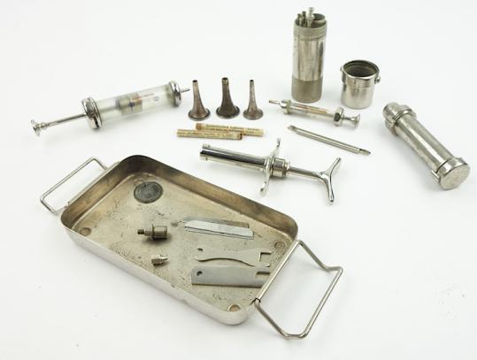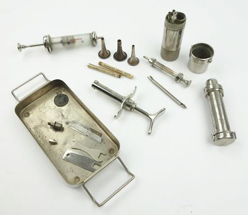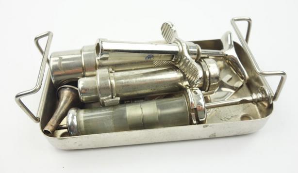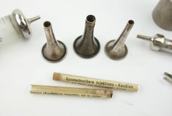 Wehrmacht Medical Syringes Medical steel Wehrmacht syringes With several spare parts, in a medical steel box. Used by Wehrmacht medical units. In used but good condition.