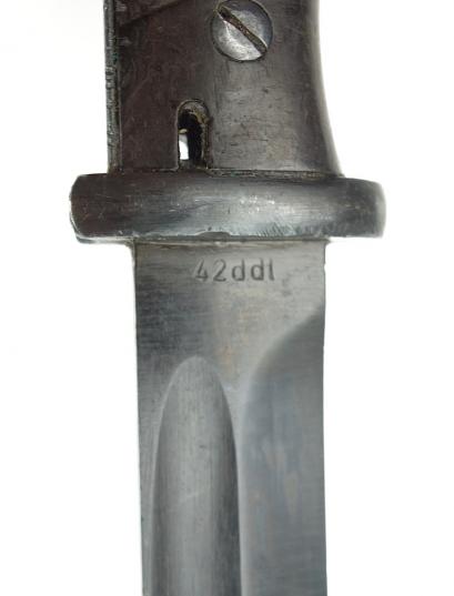 Wehrmacht K98 Bajonet Near mint non matching K98 Bajonet. Maker code marked “D.D.T.” and dated “1942” With very nice “bakelite” grips. Overal a fantastic K98 bajonet in very good condition.