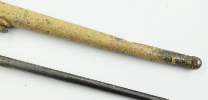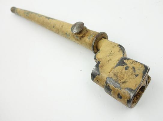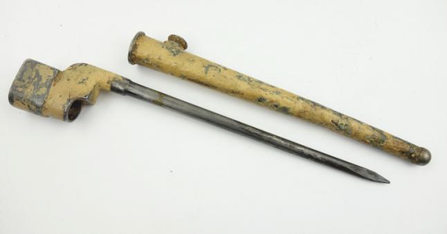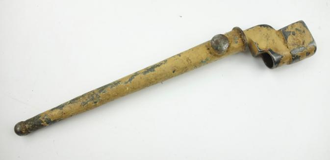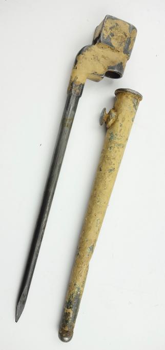 British Dessert camo Spike Bajonet Very nice used British spike bajonet in its scabbard but in dessert camo! Someting you do not find everyday among comon spike bajonets! In used but good condition.