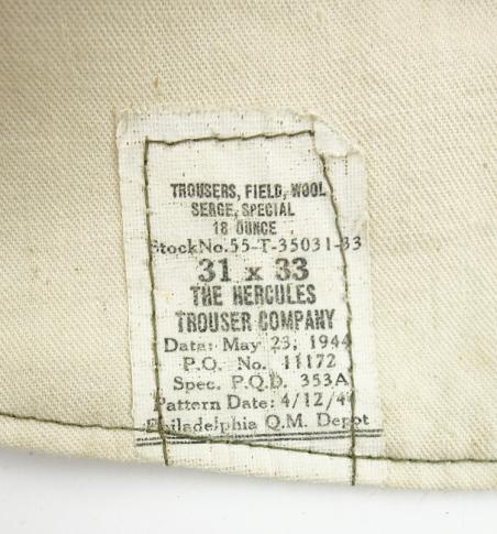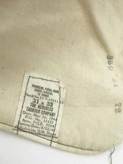 US WW2 M36 wool Trousers Made by the “Hercules Trousers Company” Dated “1944” one minor mothhole. Overal very nice US WW2 M36 wool trousers for enlisted man. In used but good condition.