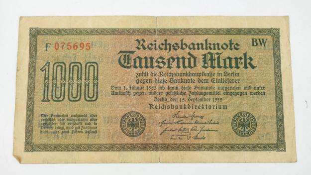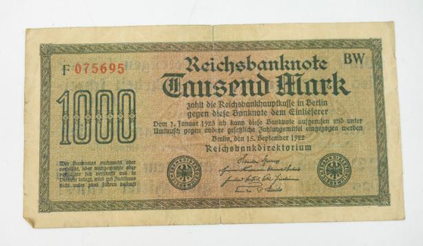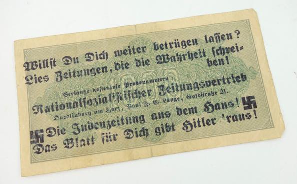 Very rare early 1930's Third Reich bank note of 1000 Reichs Marks, reprinted on its back with anti Jew propaganda "Willst du Dich weiter betrügen lassen?, Lies zeitungen, die die wahrheit schreiben, Nationalsosialistischer Zeitungsvertrieb, Die Judenzeitungen aus dem haus, Das blad für dich gibt Hitler’ raus!