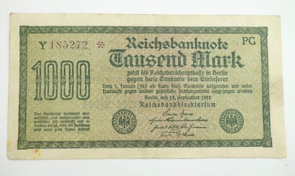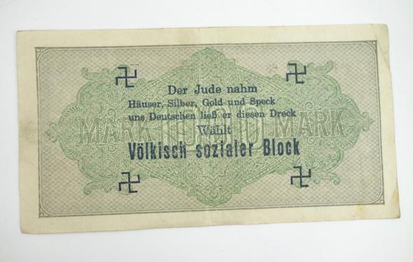 Very rare early 1930's Third Reich bank note of 1000 Reichs Marks, reprinted on its back with anti Jew propaganda "Der Jude nahm, Häuser, Silber, Gold und Speck, uns Deutscher lies er dieser dreck. Wählt Völkisch sozialer Block”