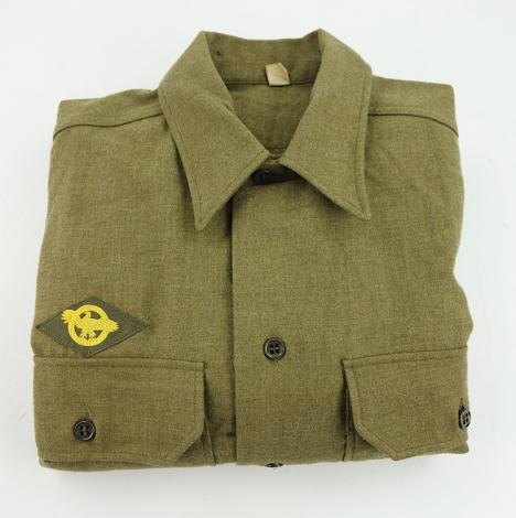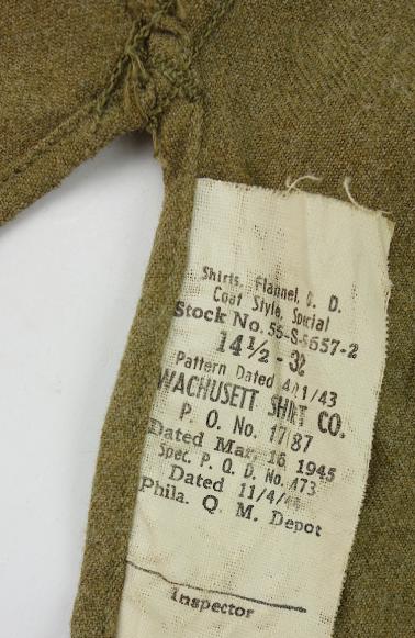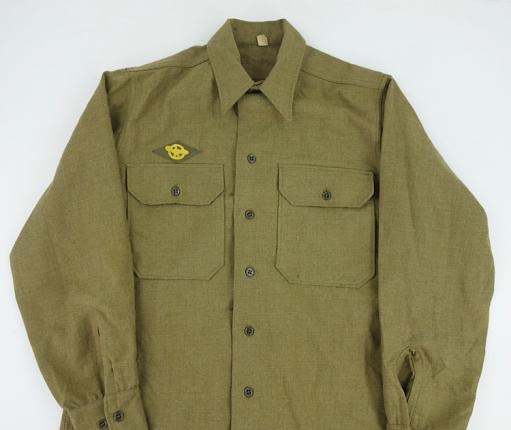 US WW2 wool Shirt Enlisted mans US WW2 wool shirt In very good condition and with cloth label Made by “Washusett Shirt Co.” dated “1945” With anti gas flap inside. Good mannequin size!