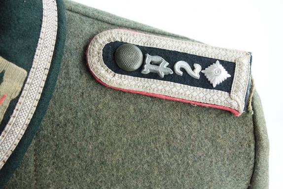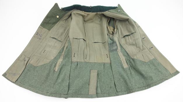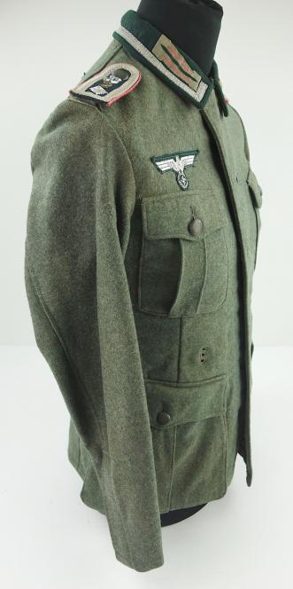 In the rank of “Feldwebel” of the “Panzer Abwehr” (anti Tank guns) the tunic comes with original but re-sewed insignia and has some wear and moth damage, but overal in used but good condition.