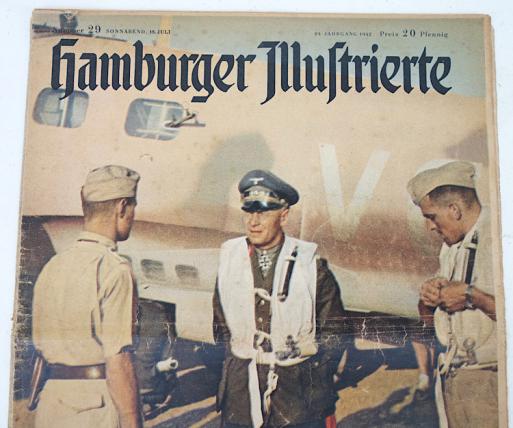 Hamburger Illustrierte Magazine Nice Wehrmacht era magazine with “Generalfeldmarschall, Erwin Rommel” on the cover. Dated “July 18, 1942”. Nice decorative magazine in good condition.