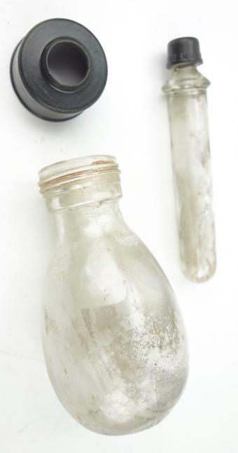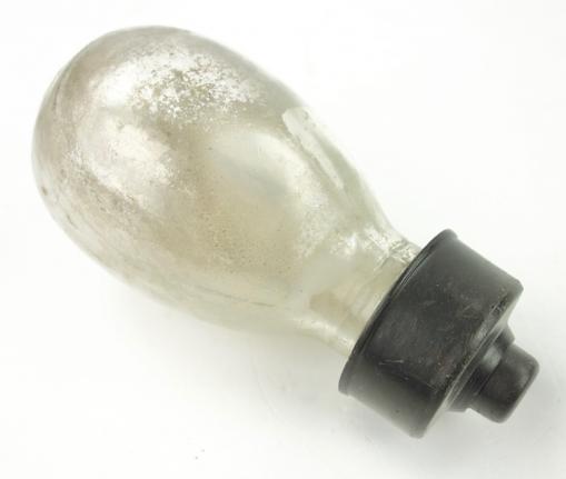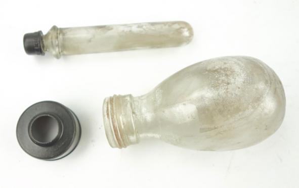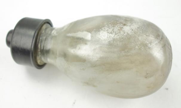 Inner glas and glas bulb where filled with two kinds of chemicals which created smock when the broken glas mixed the chemicals. Great display item!