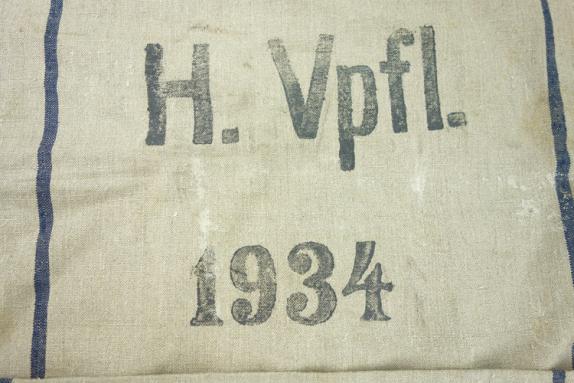 Reichswehr Supply Bag “Heeres Verplegungs Sack” marked “H.Vpfl.” And dated “1934” these big bags were used for the German Army’s food supply’s. Nice bag with big German eagle stamp in used but good condition.