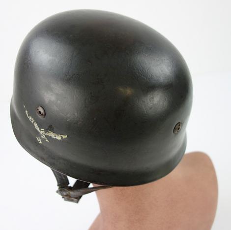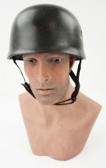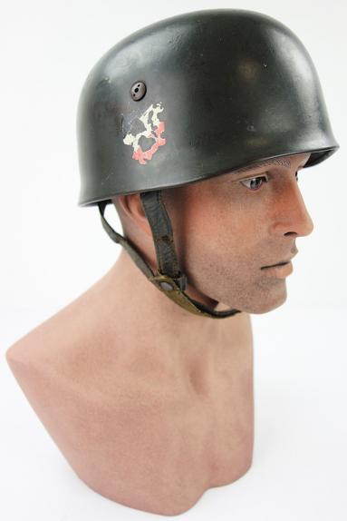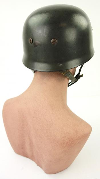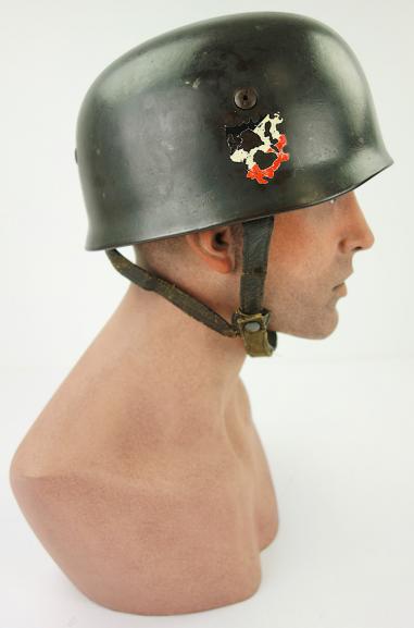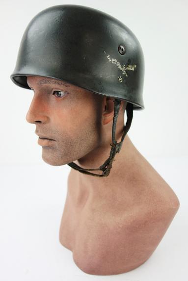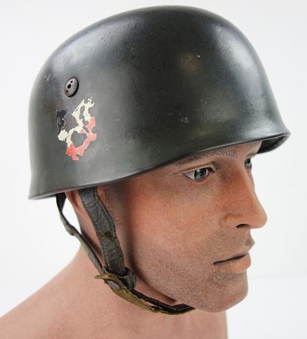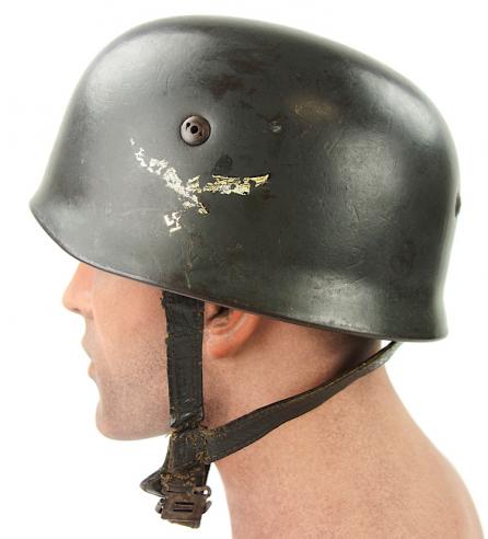 Maker code marked “ET” which is “Eisenhuttenwerk Thale” in size “68” (nice mid size Fallschirmjäger helmet) with its original liner and leather helmet straps all in used but good condition.