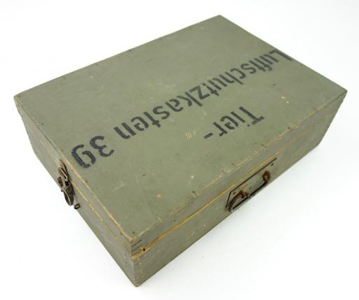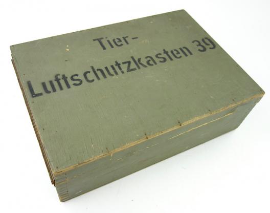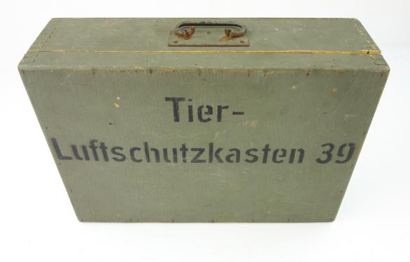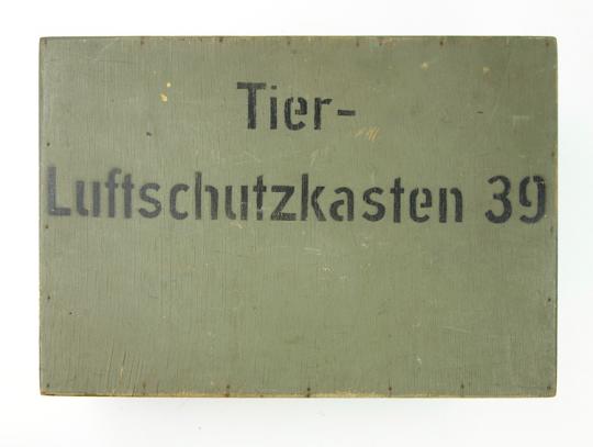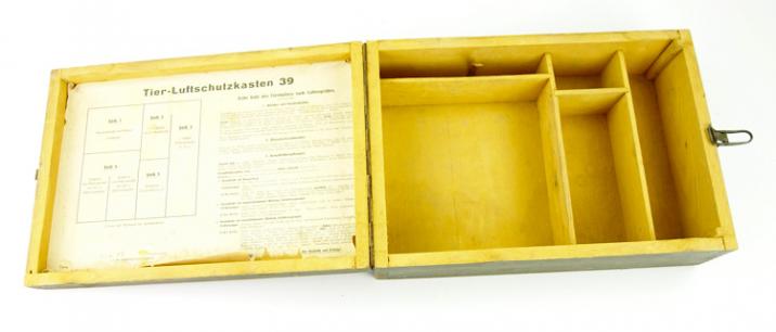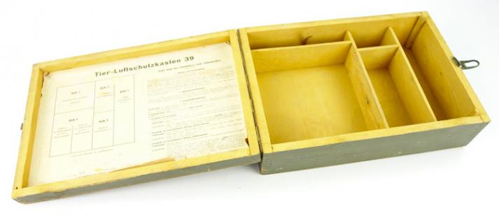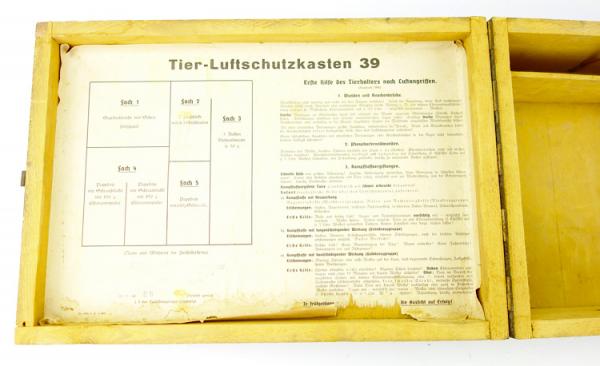Tier Luftschutzkasten 39 Wooden Animal Airraid medical box. With its original paper content label. Nice used wooden box in very good condition.