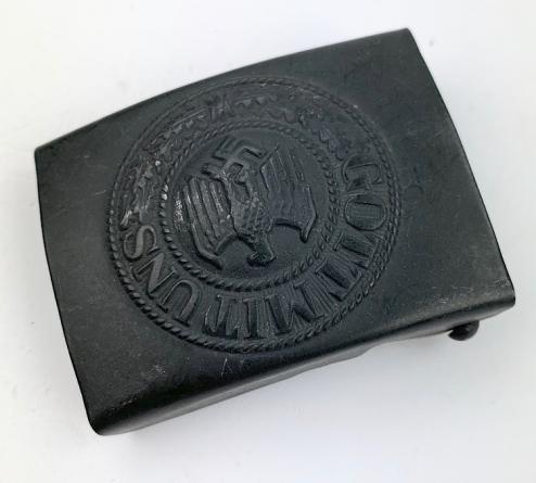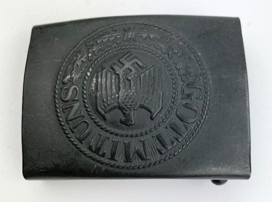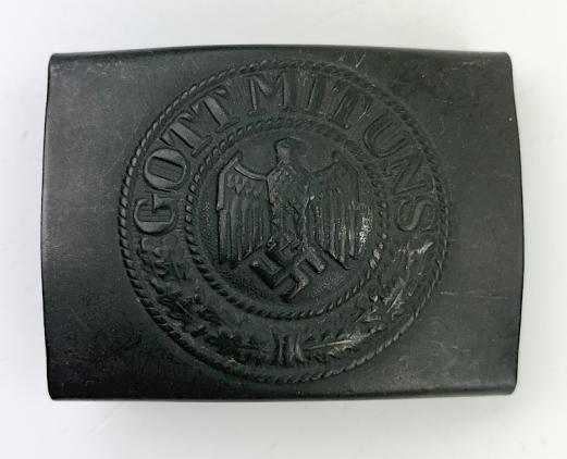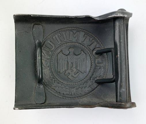 Wehrmacht steel Belt Buckle Mint late war Wehrmacht steel Belt Buckle In 98% of it’s late war camo paint. Unmarked but fantastic steel Wehrmacht belt buckle. Impossible to upgrade!