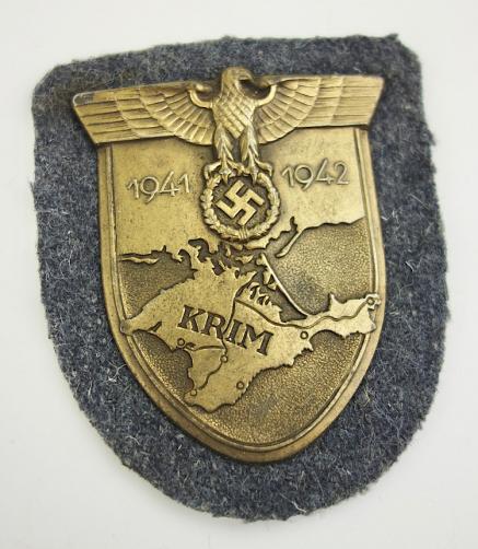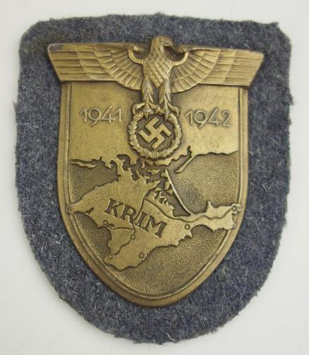 Luftwaffe Krim Shield Very nice Luftwaffe Krim Shield With Luftwaffe wool backing and its original paper finish backing. Overal very nice version of the “Krim” shield with great details!