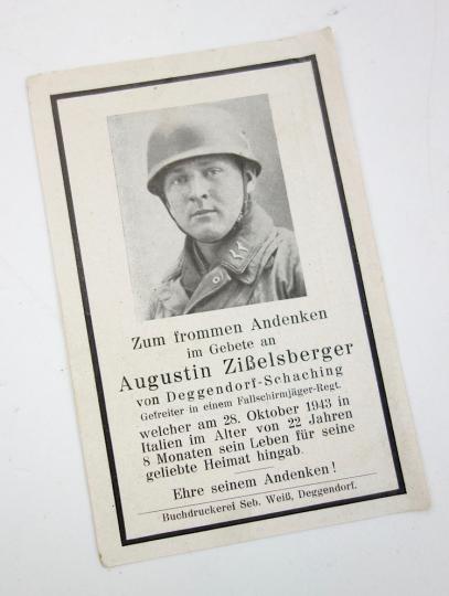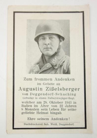 Rare Fallschirmjäger death notice of “Gefreiter Augustin Zisselsberger” von Deggendorf - Schaching” KIA at the age of “22” and 8 months on “Oktober 28, 1943” Very nice and rare Fallschirmjäger death notice in very good condition! Hard to find!
