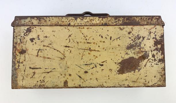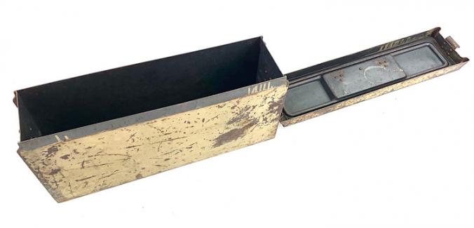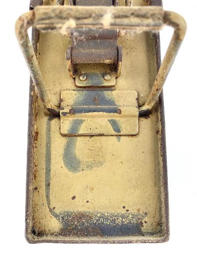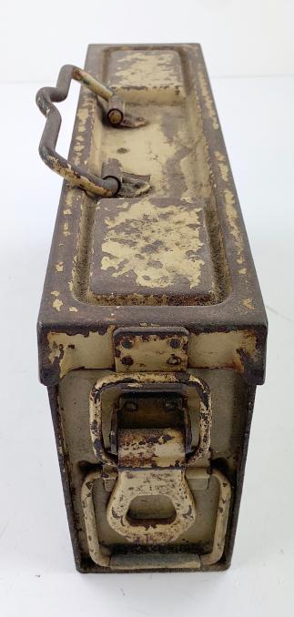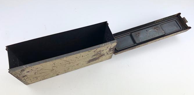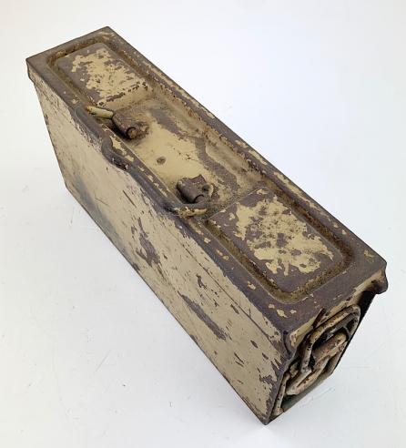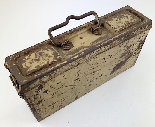 Nice used steel Wehrmacht MG34/42 camo Ammunition Box. Base color is field-grey and then over sprayed with the tropical camo paint.