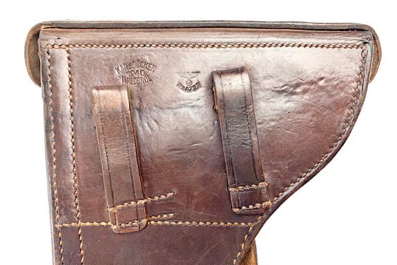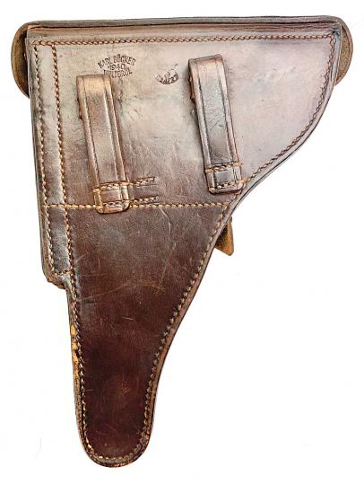 Very nice used Luftwaffe chocolate brown P08 Holster. Maker marked “Karl Bücker, Waldbrül” and dated “1940” and “Waffen Ambt” stamped.