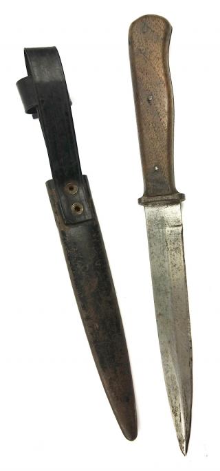 Nice used Wehrmacht close combat knife in its original metal scabbard with a celluloid belt loop.