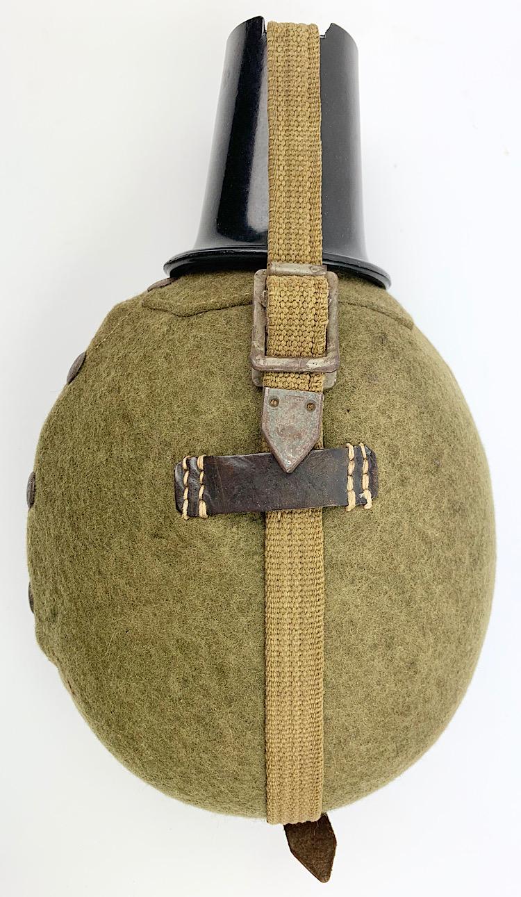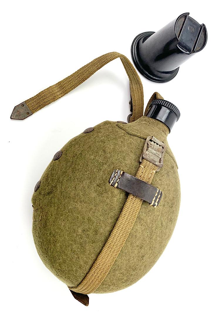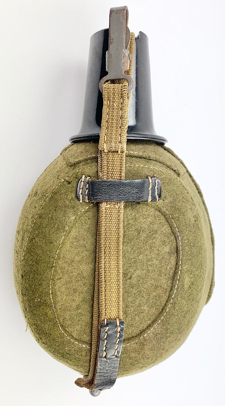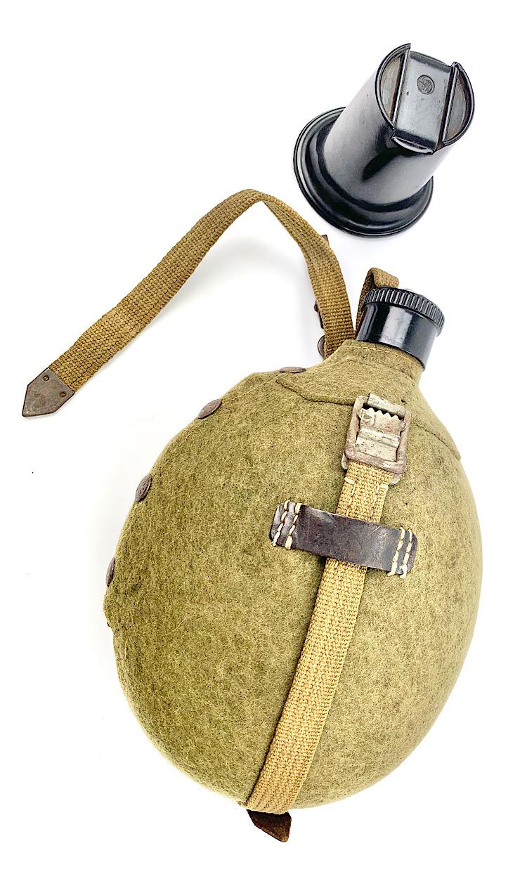 Wehrmacht M31 Cateen Big size “1 liter” Wehrmacht M31 canteen with tropical webbing straps and bakelite cup. Nice canteen in used but very good condition.