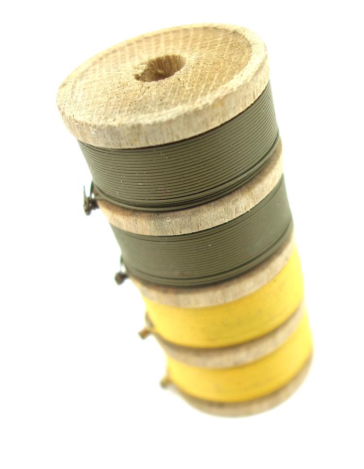 US WW2 Booby Trap Trip Wire Original wooden bobbin with yellow and green trip wire for demolition and building booby traps. For the US WW2 combat engineers and special forces. In very good condition.