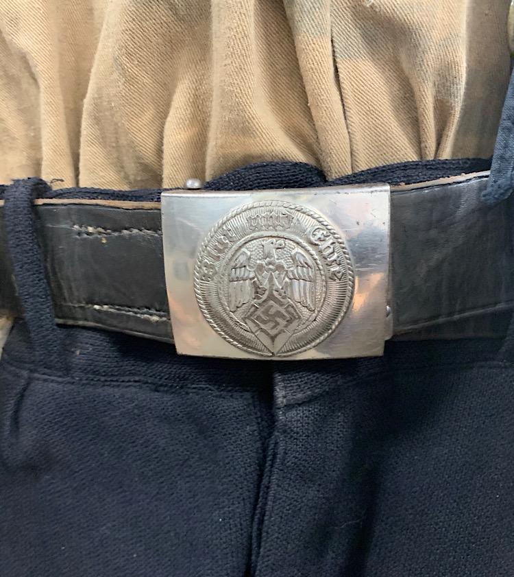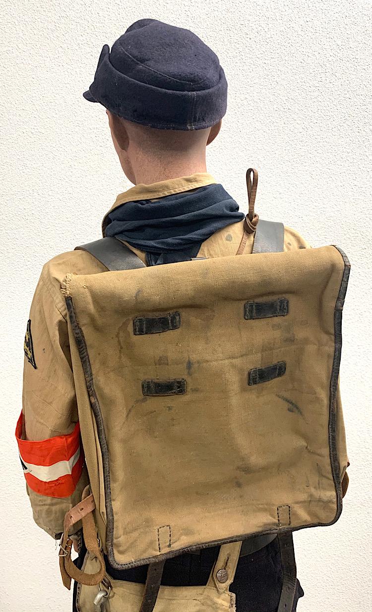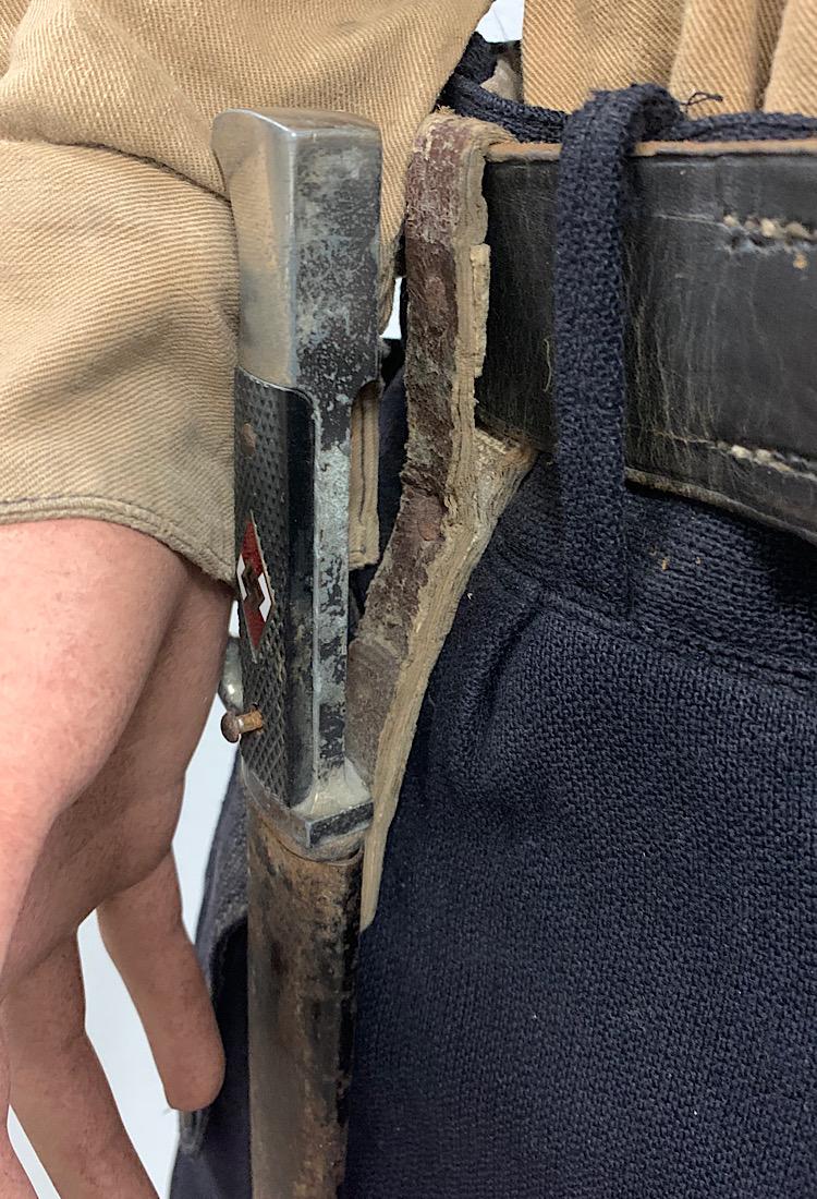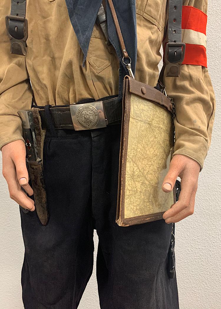 Very complete Hitler-Jugend tunic and equipment with a very nice custom painted mannequin by artist “Roel Brink” (the best!) very nice used tunic with trousers, low boots, cap, scarve, knot, belt and buckle breadbag, canteen, backpack, shoulder strap, map in mapcase, wistle and a used dagger (missing one part of the grip) district insignia is “West Ruhr Niederreihn”