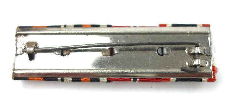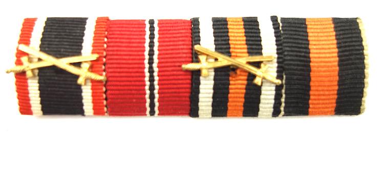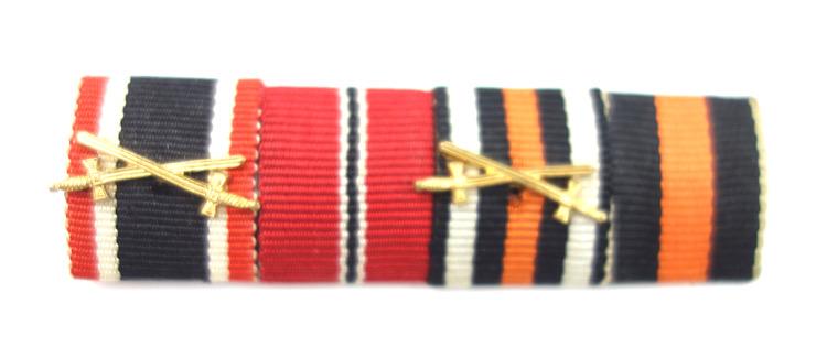 Nice Wehrmacht ribbon bar with war merrits cross ribbon, frontkämpfer 1914-1918 medal ribbon, Ost medal (Winterschlacht im Osten) and 1 Oktober 1939 medal ribbon. Overal a very nice ribbon bar, fantastic on a Wehrmacht tunic!