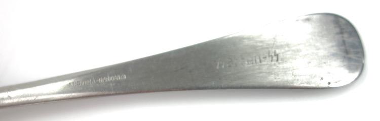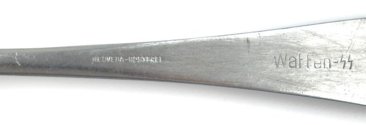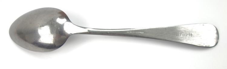 WaffenSS Baracks Messhal Spoon Very nice metal spoon marked “WaffenSS” used in WaffenSS the barracks messhal. Maker marked “Medveda Rostfrei” In used but very good condition