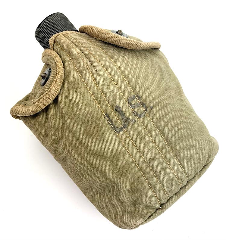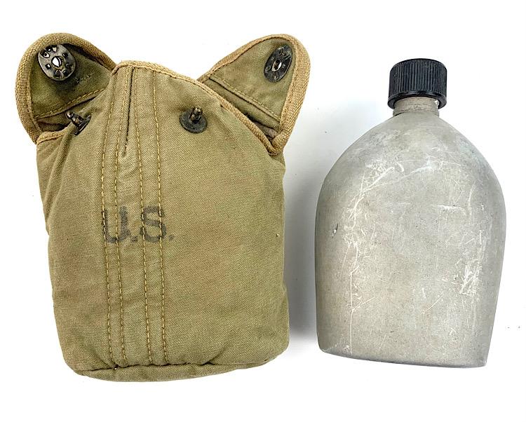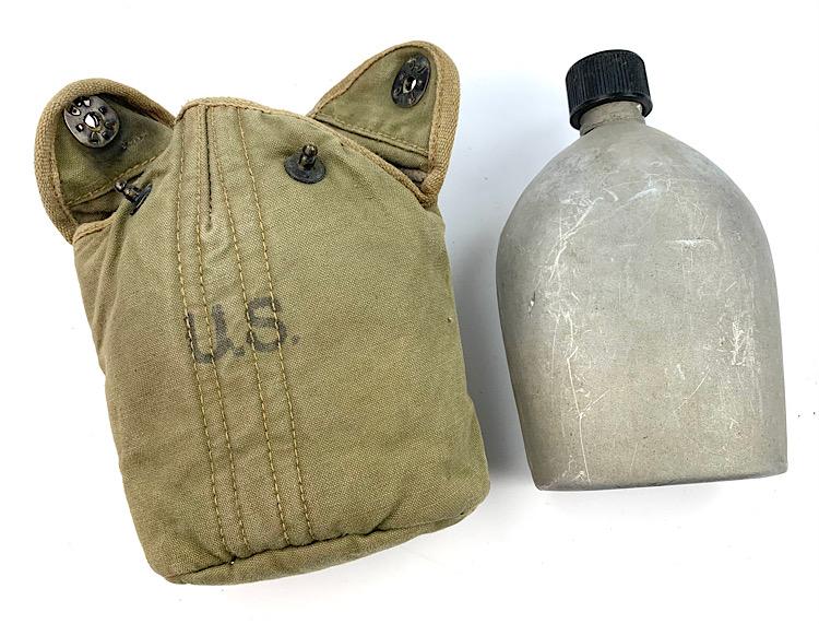 US WW2 Canteen Nice aluminium “1945” dated canteen without cup in original canvas US marked cover. In used but very good condition.