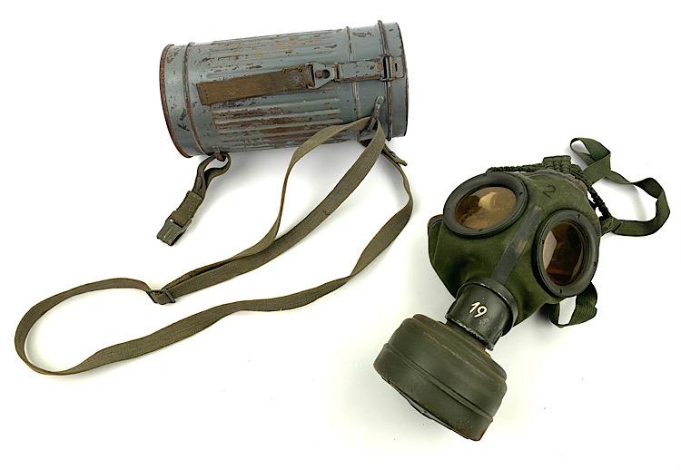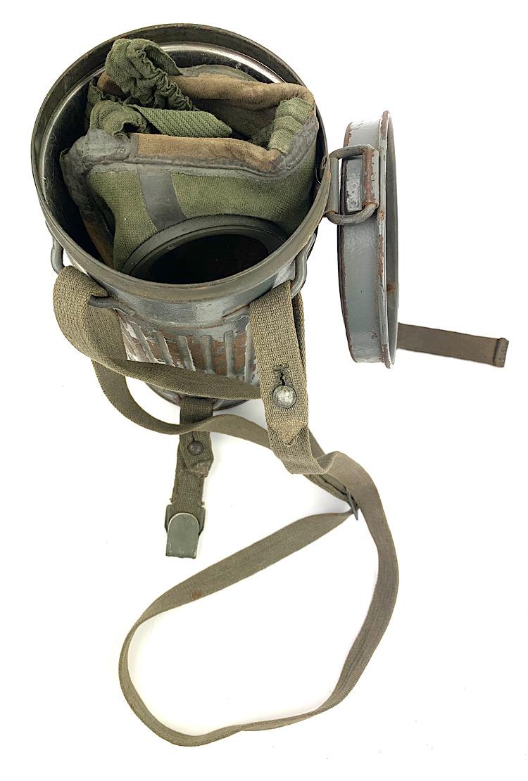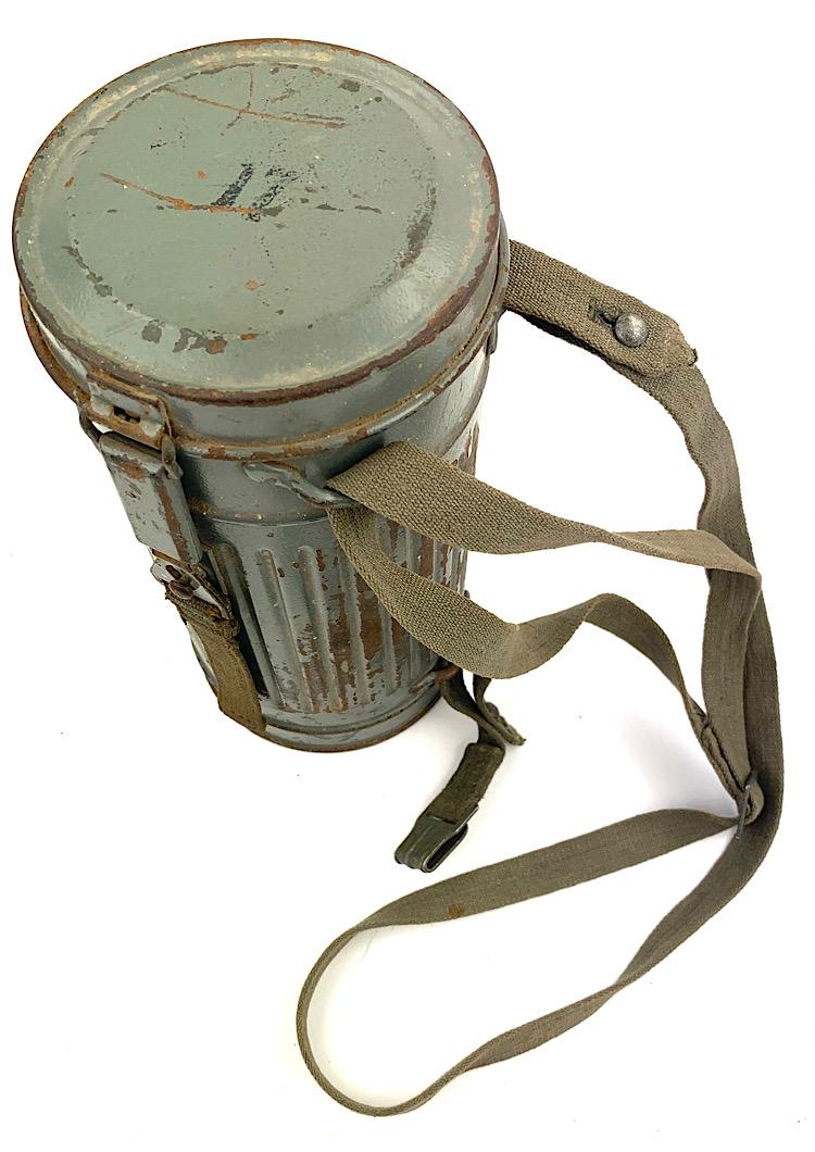 Nice named Wehrmacht M31 gasmask in ship grey camo on top of the standard field/grey camo paint cannister. Nice early short model cannister.