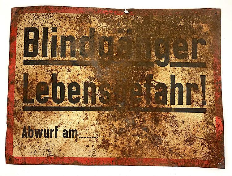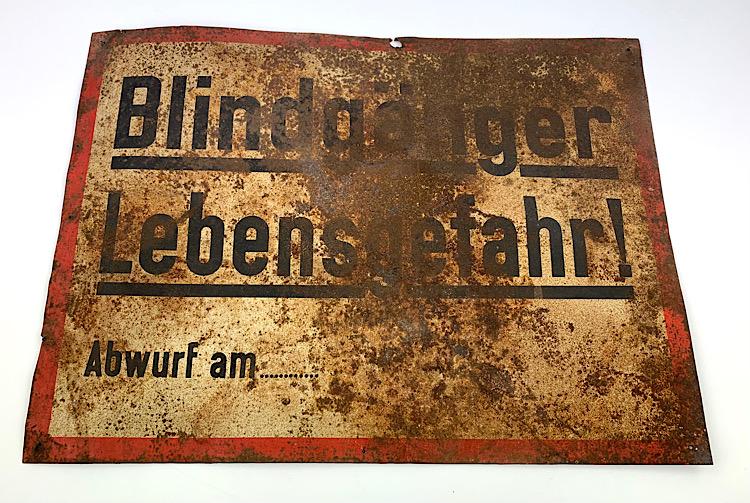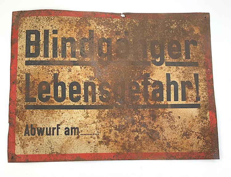 Wehrmacht Warning Sign (Blindgänger) Nice used metal Wehrmacht Warning Sign (Blindgänger) un-exploded Bombs “Blindgänger Lebensgefahr, Abwurf am....” In used but good condition. Great display item!!!