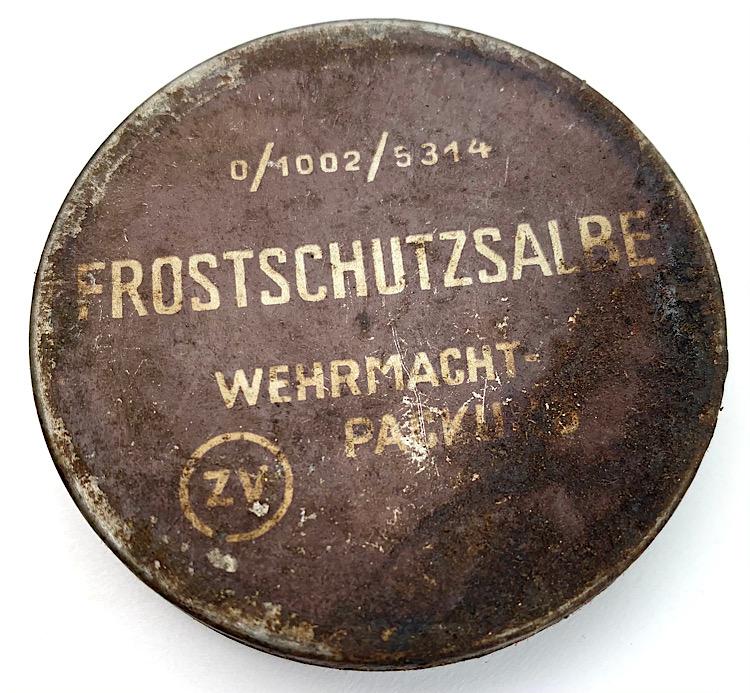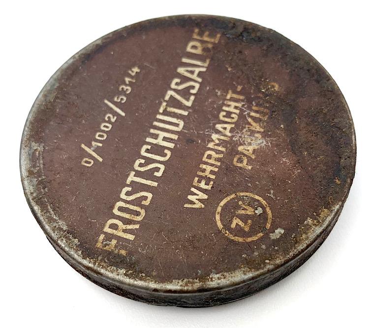 Nice original metal can Wehrmacht “Frostschutz Salbe” skin ointment to protect the skin against ice cold and freezing weather. Nicely marked “Wehrmacht Packung” nice used metal can with content in good condition.