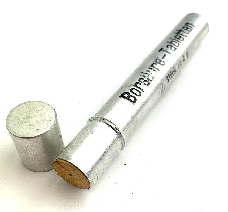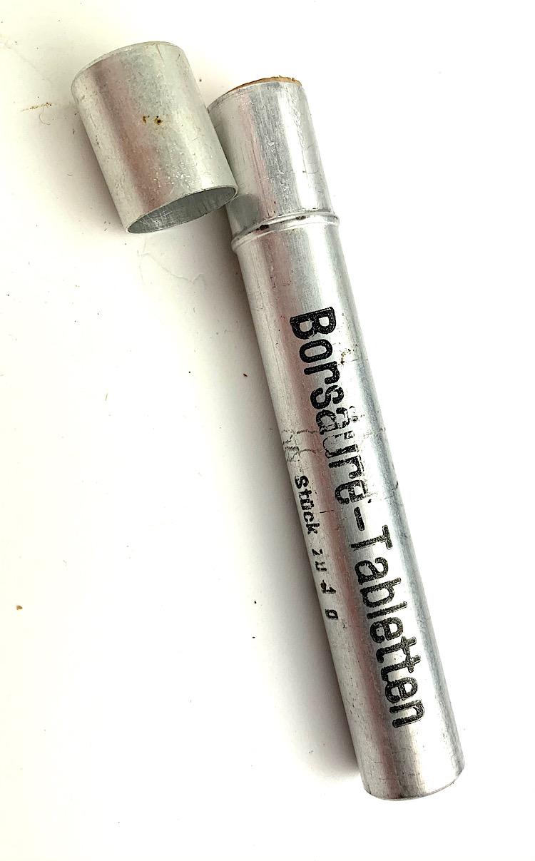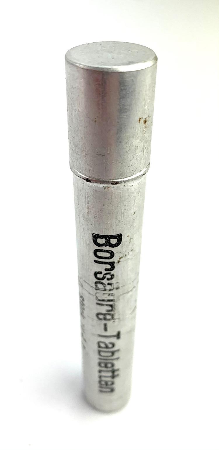 Wehrmacht Borsäure-Tabletten in aluminium Tube Nice Wehrmacht aluminium medical tube with original content. “Borsäure-Tabletten” nice for a medical display! Ik very good condition.