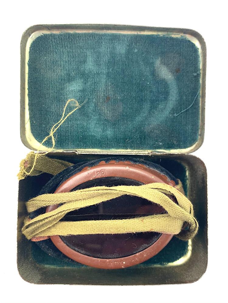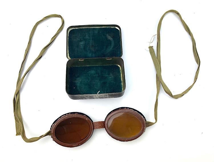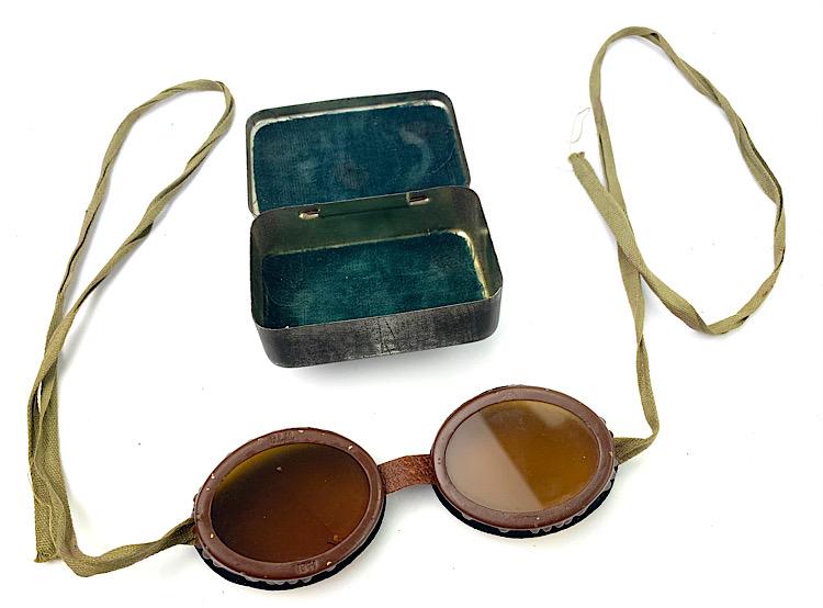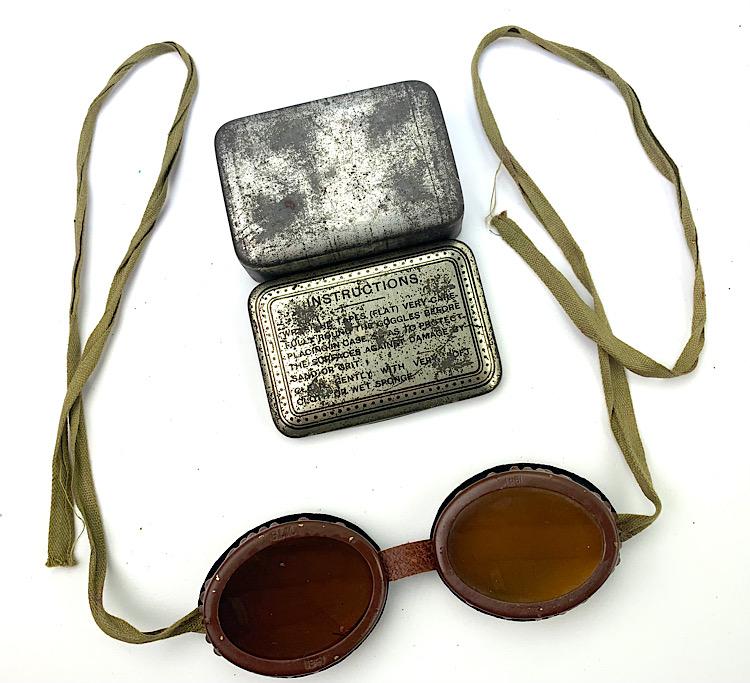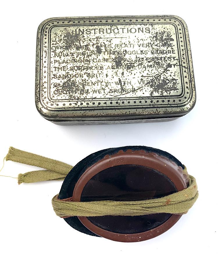Very nice used British WW2 Dust Goggles in metal case. Dated “1941” metal case printed with instructions for use. One of the glases has a crack but tge goggles are still great for display on a British helmet or mannequin.