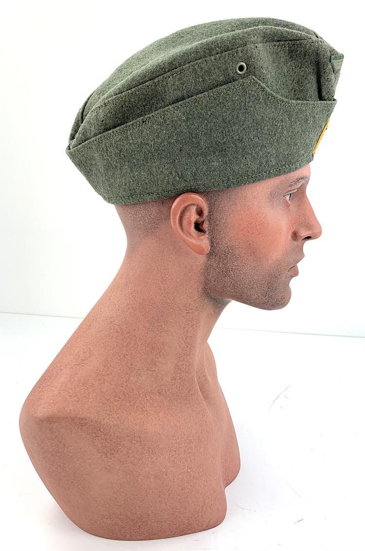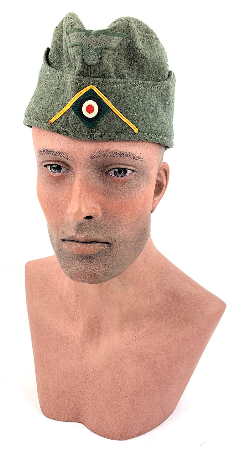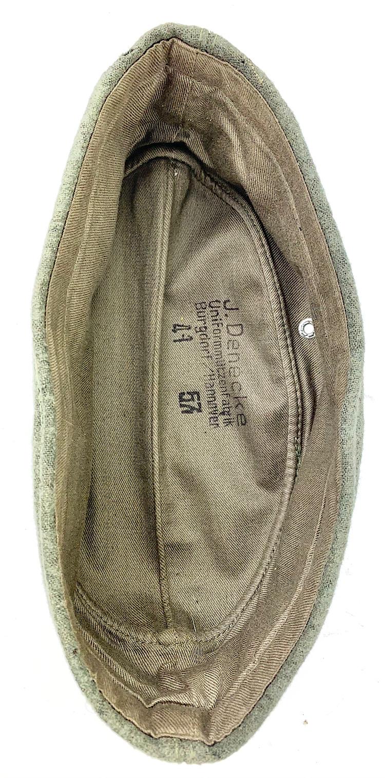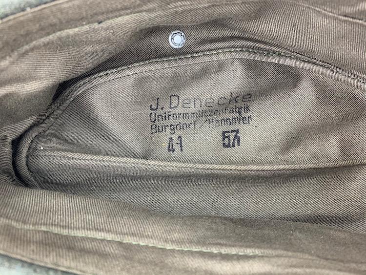 Very nice near mint Wehrmacht M40 wool side cap, for enlisted soldiers in the (Signal Corps) “Nachrichten” made by “J. Denecke, Uniformmützenfabrik, Burgdorf/Hannover” dated “1941” and in good size “57” with original “Bevo, Wuppertal” made Insignia and yellow “Soutach” (Signal Corps) Fantastic Wehrmacht M40 side cap with minor moth, but overall in near mint condition. Great to complete a “Nachrichten” mannequin or for a headgear collection. Hard to find these days!