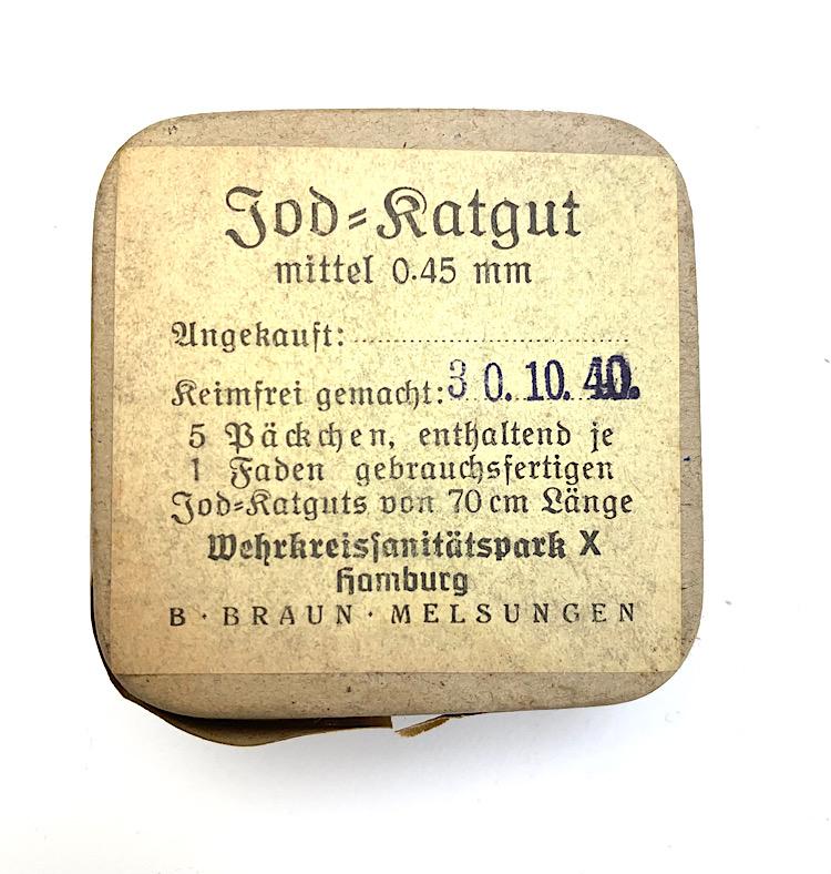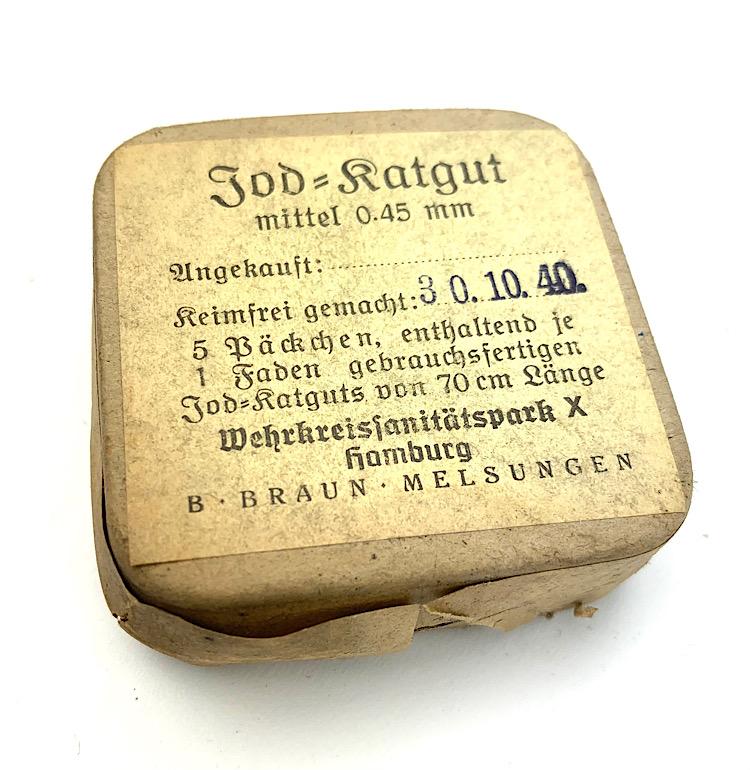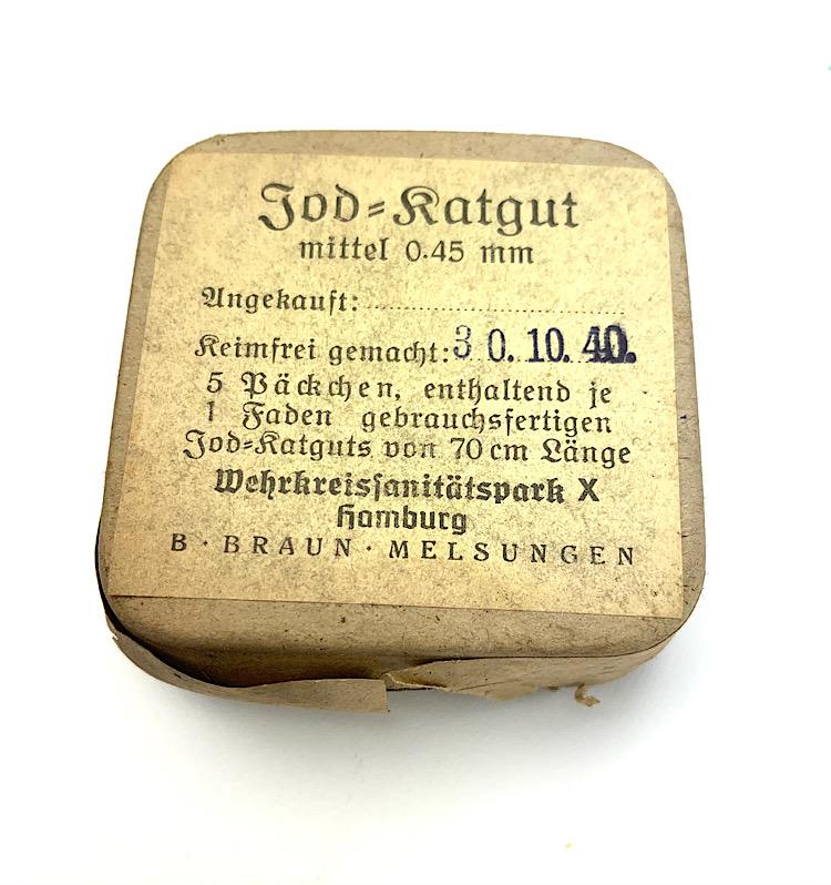 Wehrmacht Medical Sature Jod-Katgut 5 packages in this original carton case of Wehrmacht sature. Jod Katgut Dated "1942, Hauptsanitätspark, Berlin” In very good condition.