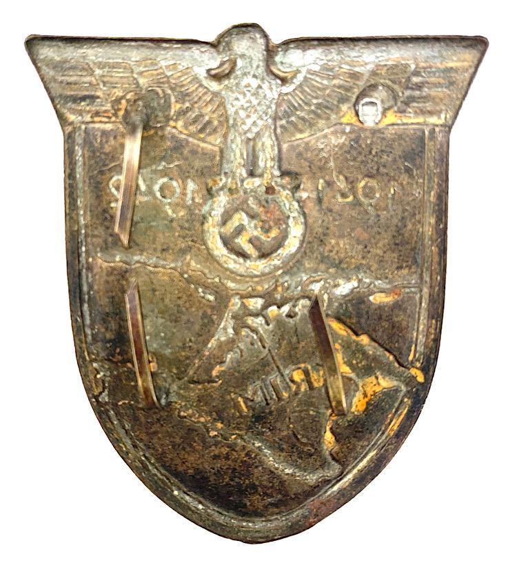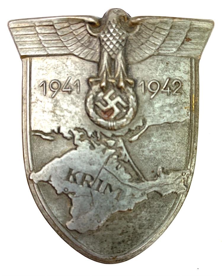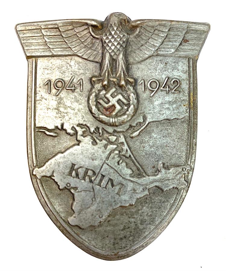 Wehrmacht Krim Schield “Krim 1941-1942” nice used uniform removed Wehrmacht Krim Schield. Great for a medal/award collection or to complete a tunic. In used but good condition.
