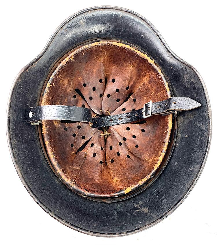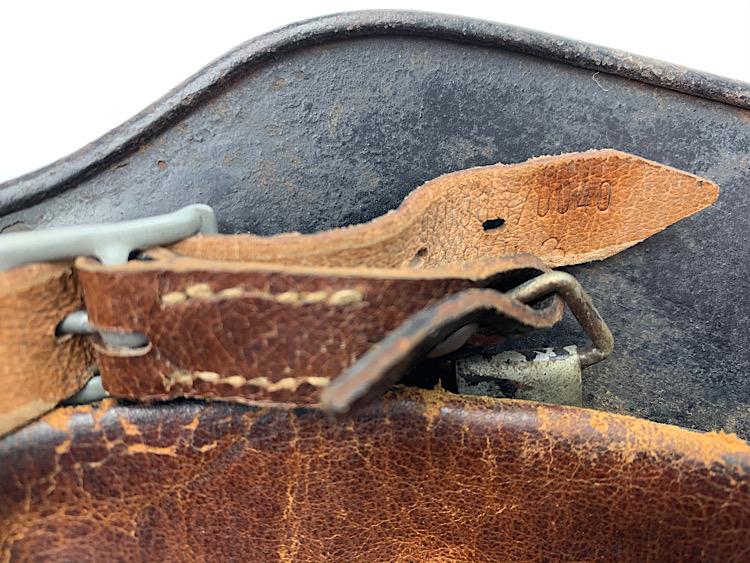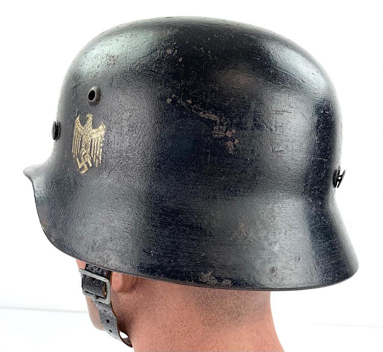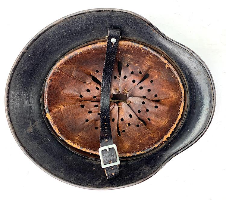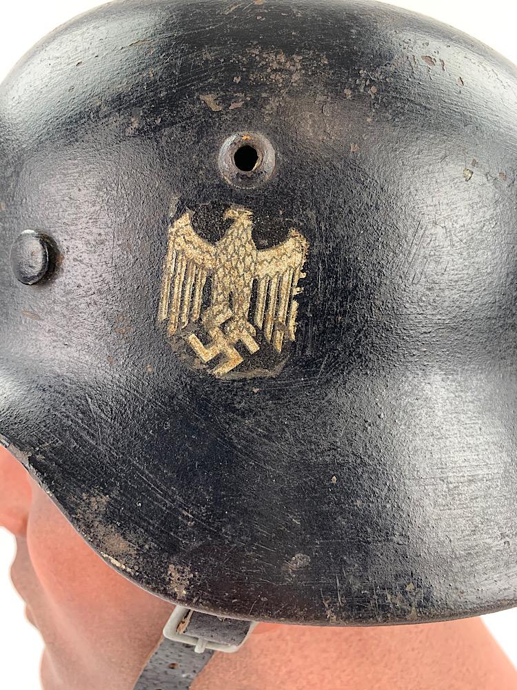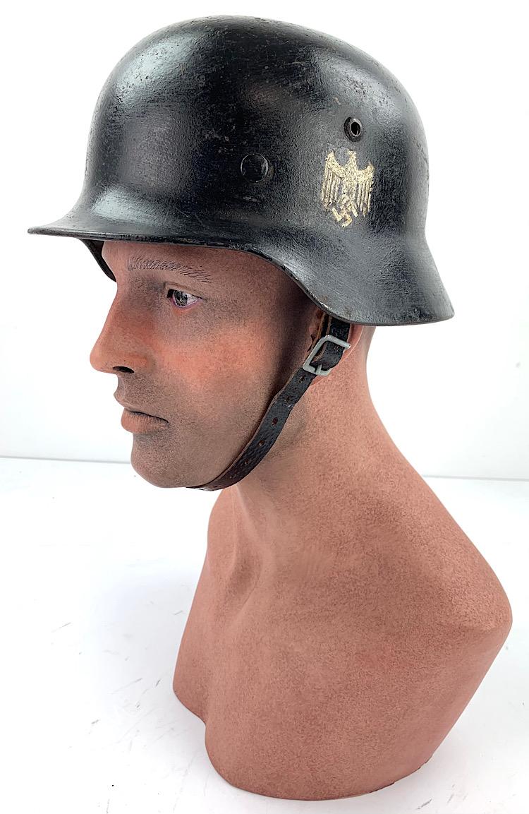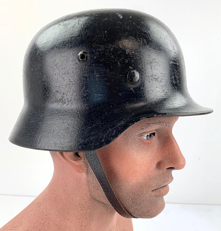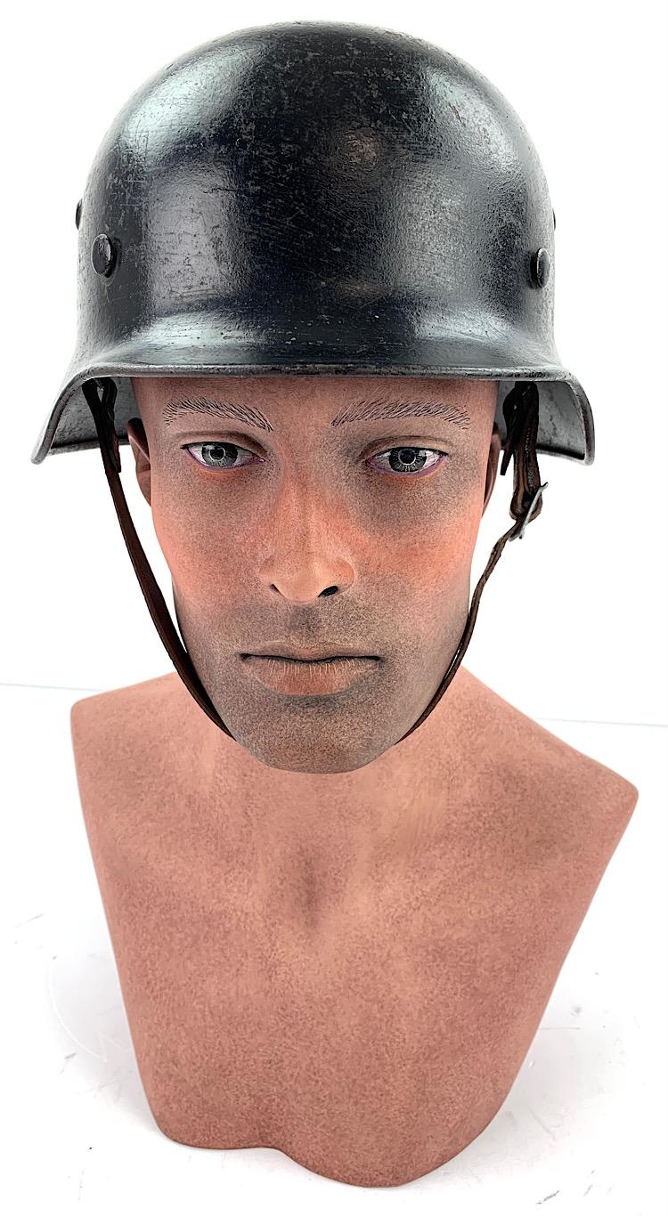 Very nice used Wehrmacht M40 SD helmet with black camo paint often done by Wehmacht Flak units (Anti Aircraft Artillery) maker marking not visible because of the camo paint. Helmet comes with its original liner (never being removed) and original “pig skin” leather combat helmet strap. Good helmet size for a mannequin “56/57” overal a very nice Wehrmacht M40 SD helmet in used but very good condition.