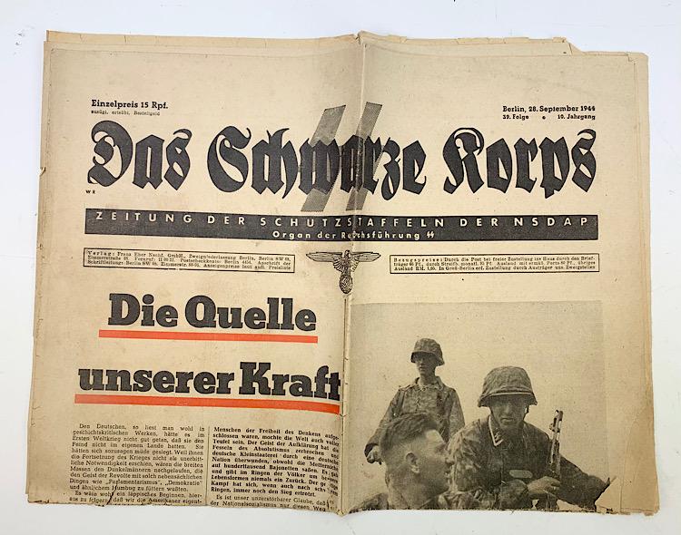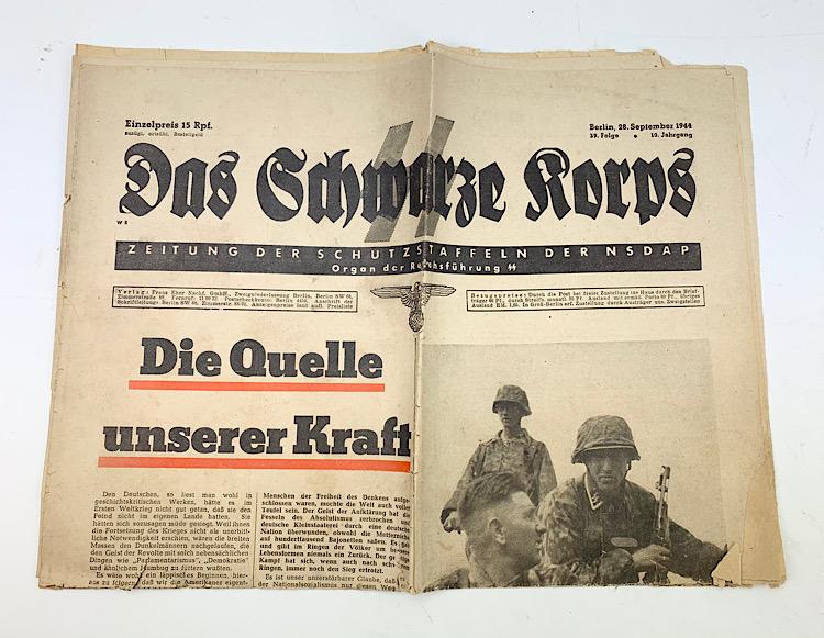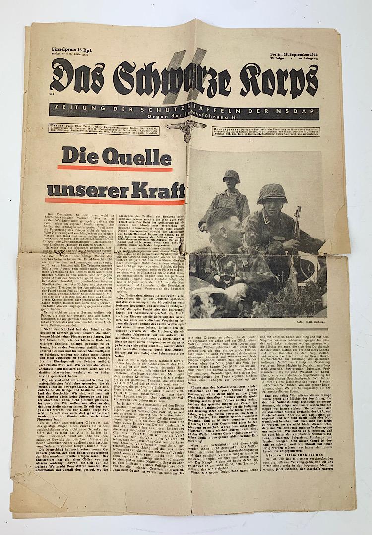 WaffenSS Newspaper Das Schwartze Korps Dated September 28, “1944” “Das Schwartze Korps” fragile but nice WaffenSS news paper. Great for display in a frame.