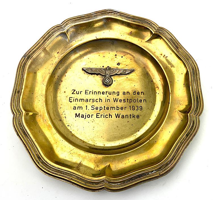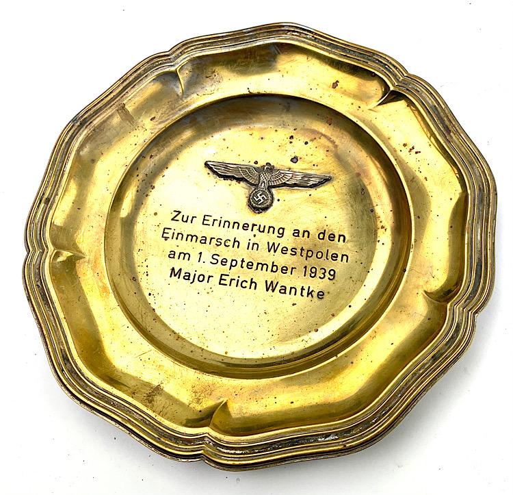 Nice engraved metal wall bowl as present to a Wehrmacht Officer. “Zur Erinnerung an den Einmarsh in Westpolen am 1 September 1939, major Erich Wantke” (for the memory of the attack at Westpolen, September 1, 1939”