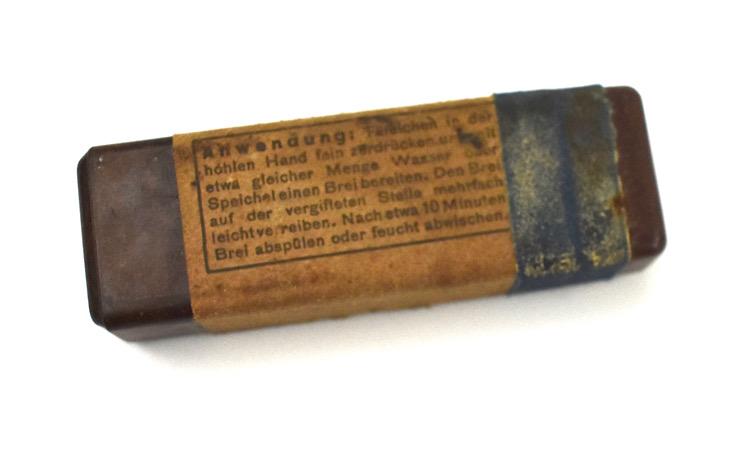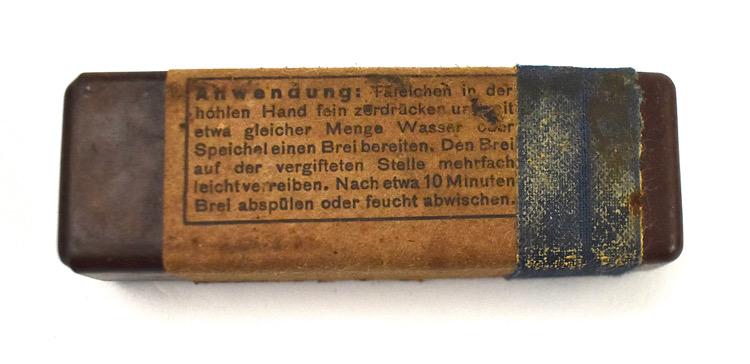 The box belongs in every Wehrmacht M31 gasmask cannister. The tablets where used to clean the skin after a poison gas attack. “Hautentgiftung”