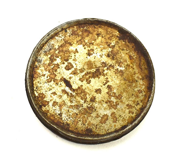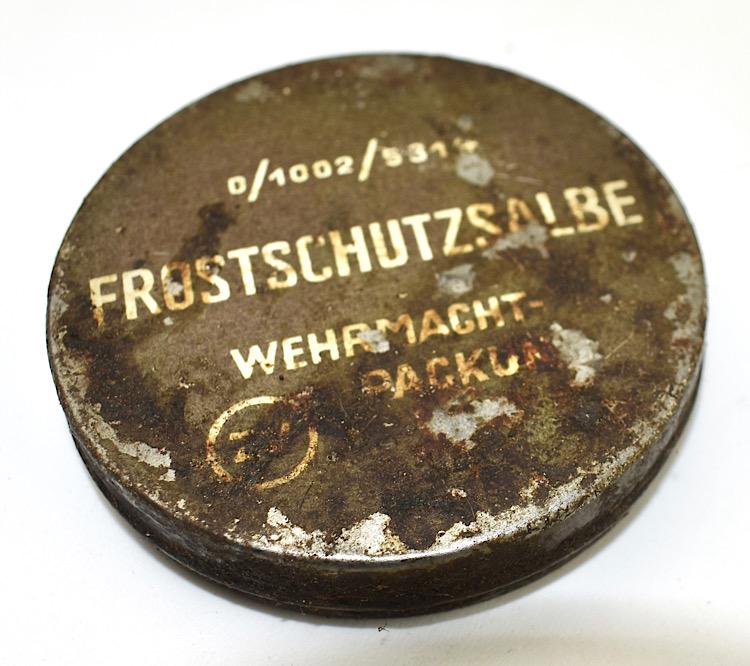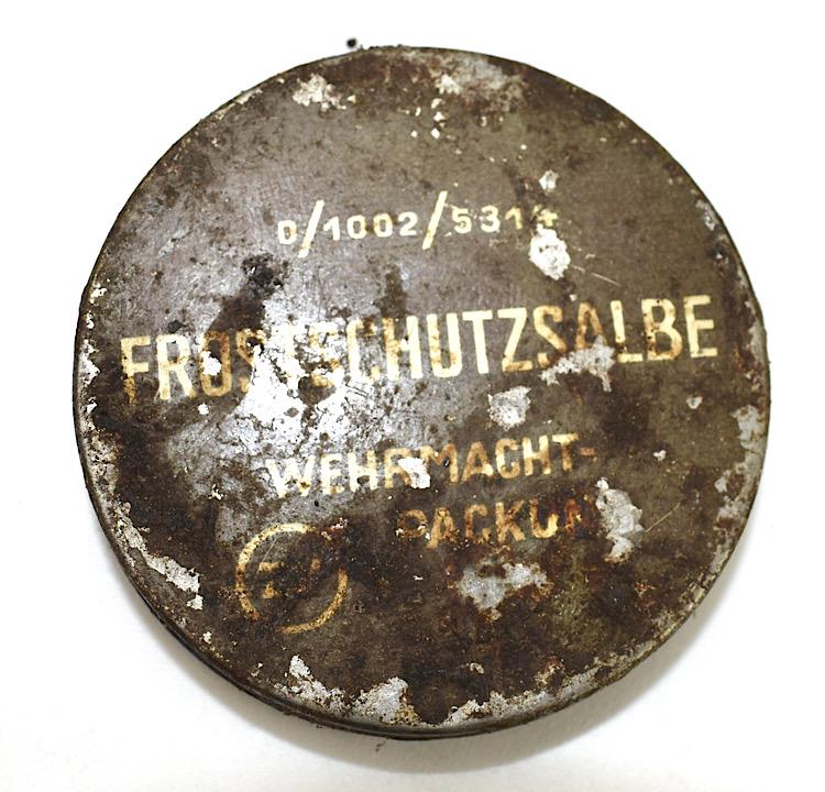 Nice original metal can Wehrmacht “Frostschutz Salbe” skin ointment to protect the skin against ice cold and freezing weather. Nicely marked “Wehrmacht Packung” nice used metal can with content in good condition.