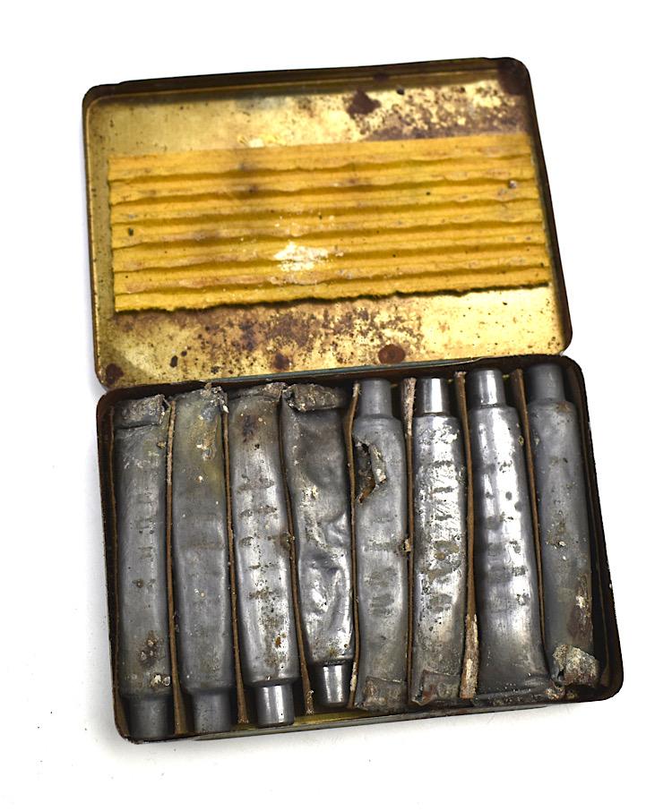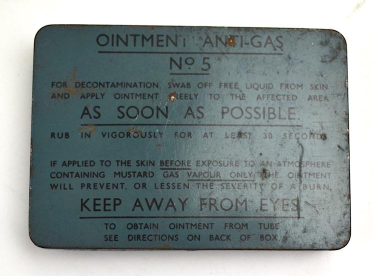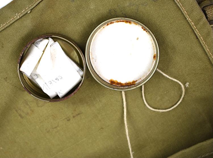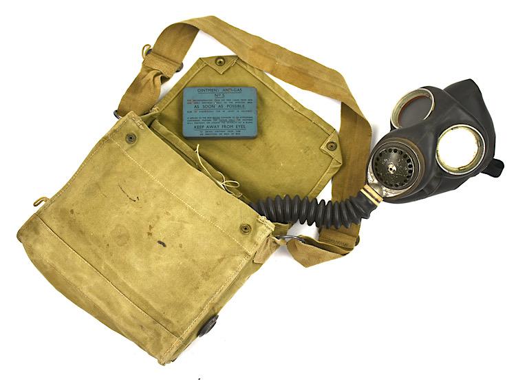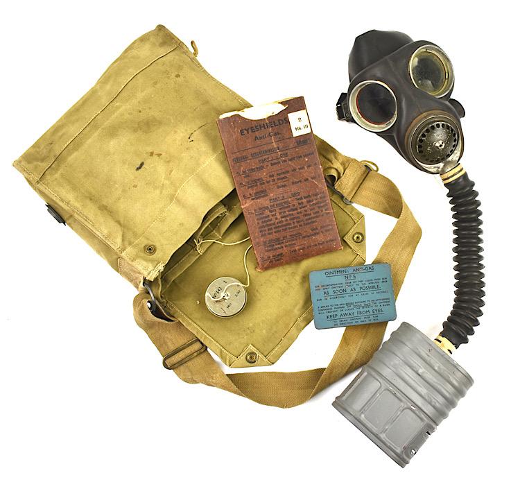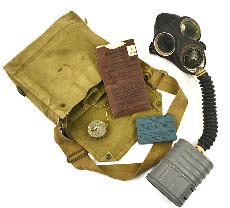 Nice used but very complete British WW2 early type gasmask in pouch, complete with anti gas ointment in tubes in there original metal can, cleaning cloth in metal can and eye shield in carton packaging.