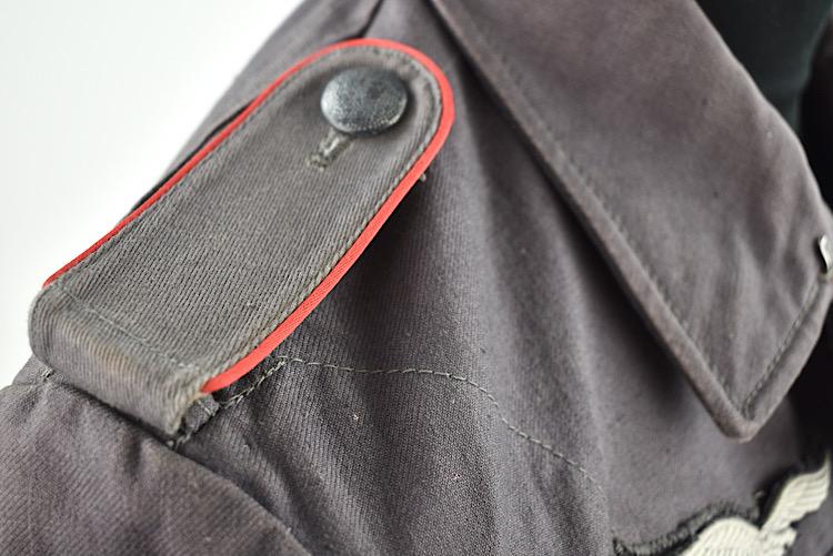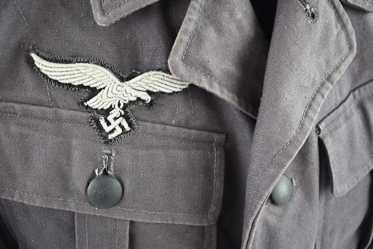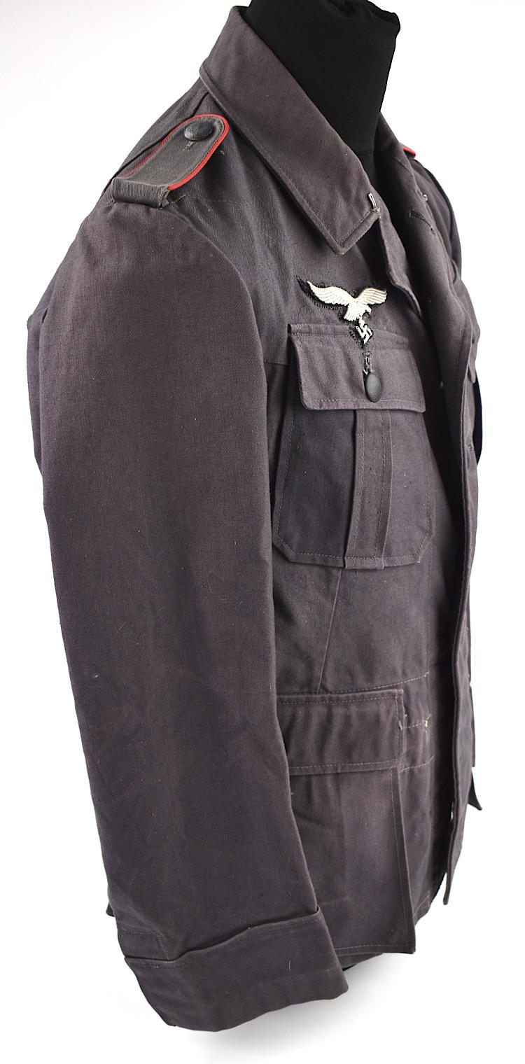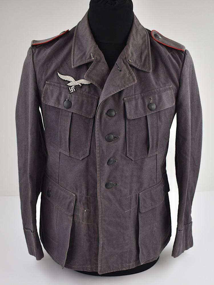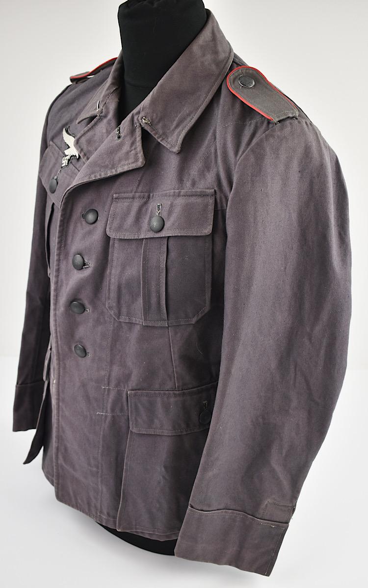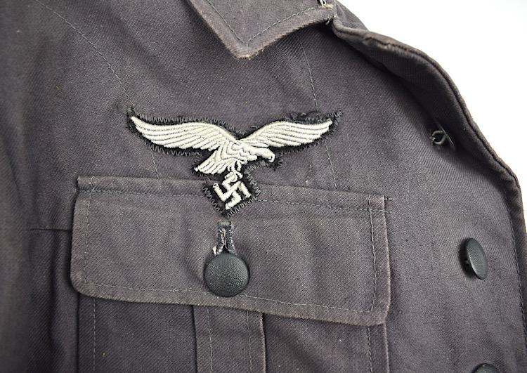 Extreme rare to find Blue 4 pocket Luftwaffe Field Division tunic, with original sewed eagle (it came a little loose) and original rare blue summer “FLAK” (Flugzeug Abwehr Kanonne) shoulder boards “AA Gun” made by “Peek & Cloppenburg, Berlin” size marked. And in used but very good condition.