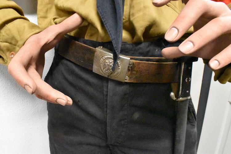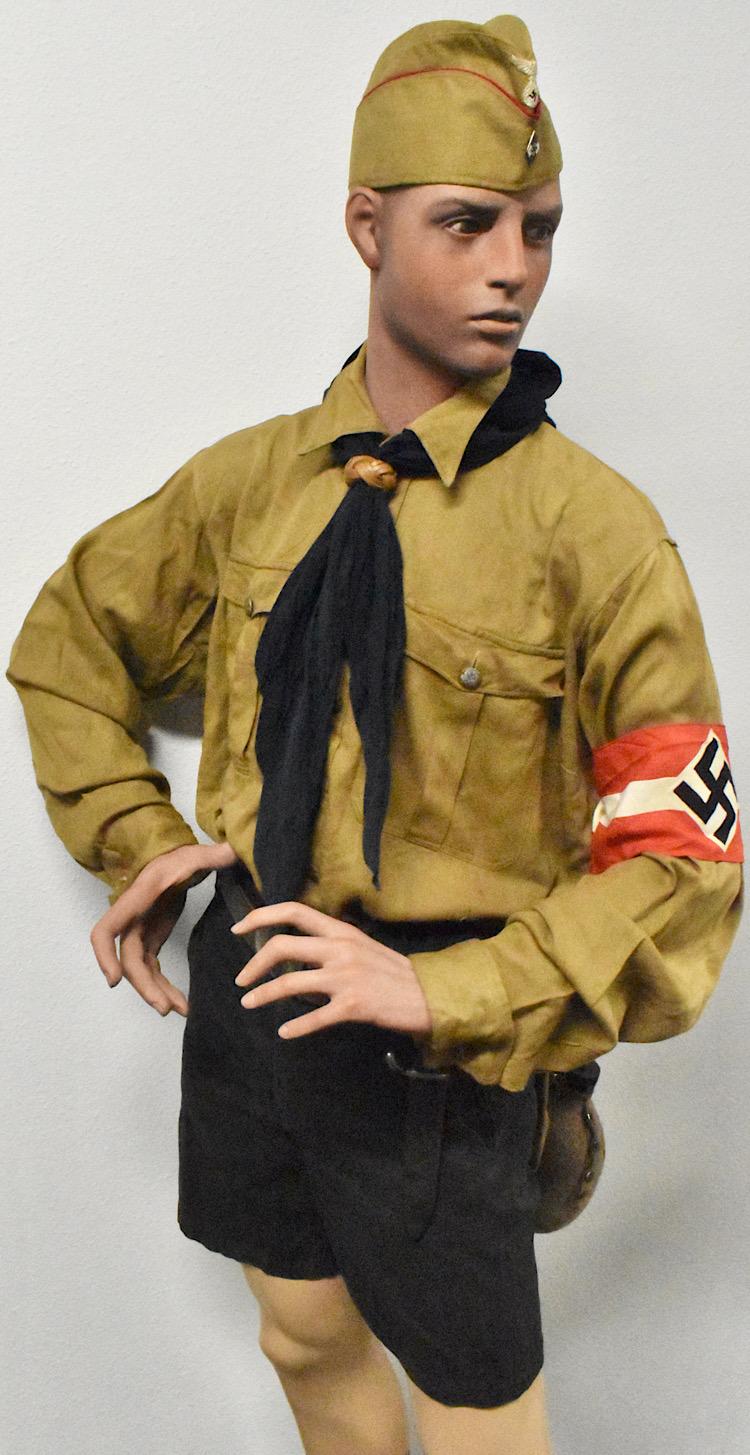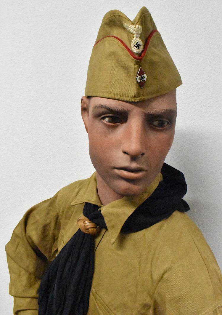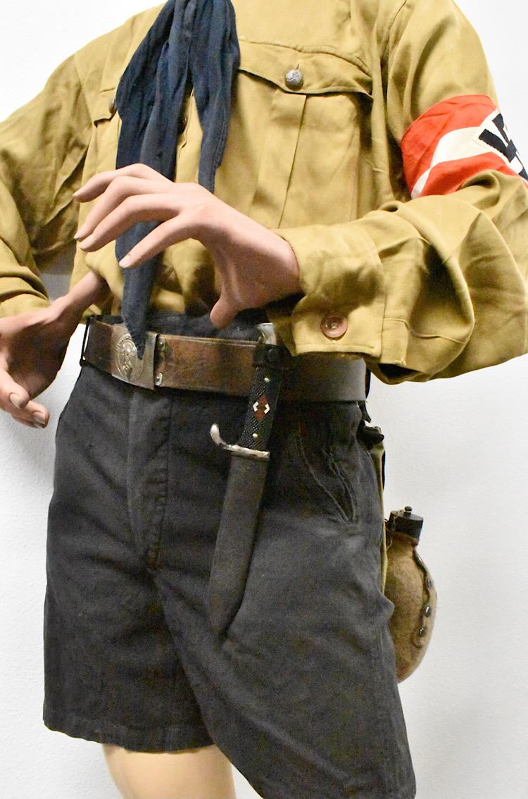 With Hitler-Jugend Shirt, armband, Shorts, Scarve and knot, Side Cap, Socks, HJ, belt and buckle, breadbag, canteen and a nice Hitler-Jugend knife marked “RZM M7/25” which is a rare maker “Wilhelm Wagner, Solungen-Merscheid” shoes not included. overall a very nice complete mannequin with an almost complete and original Hitler-Jugend tunic and equipment. Notice! Shipping Possible, € 50,- extra shipping cost because of weight and volume!